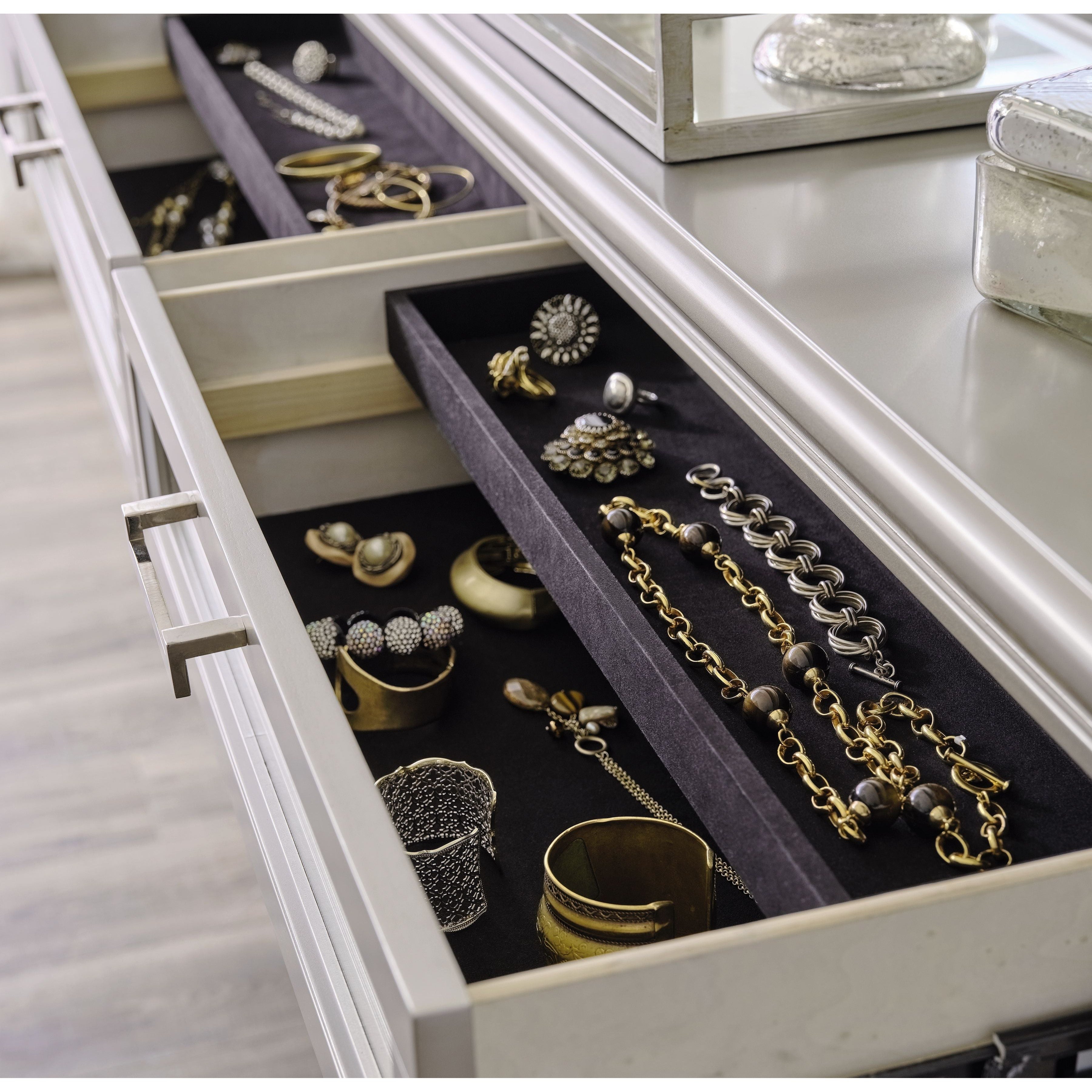 - Jewelry tray inside each top drawer