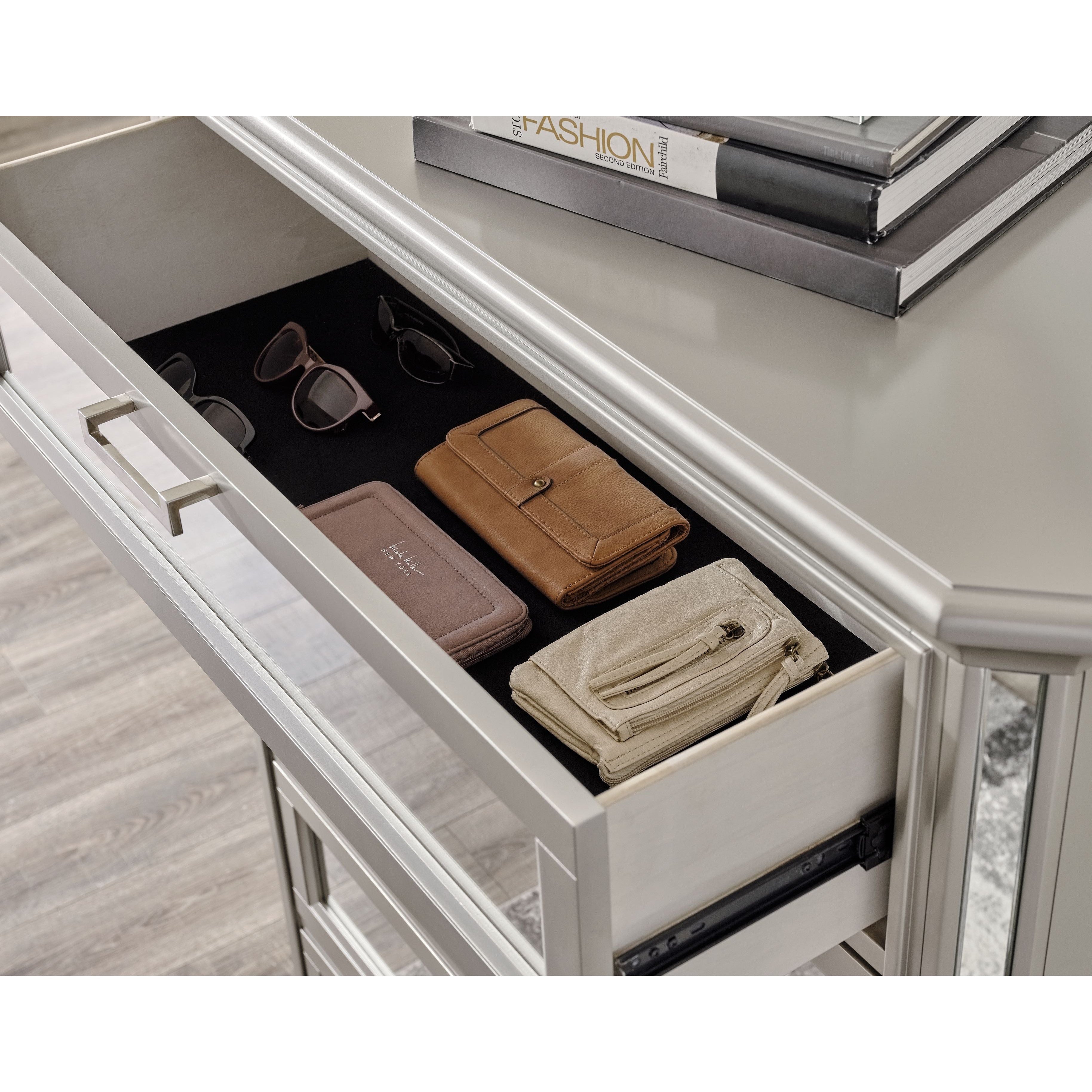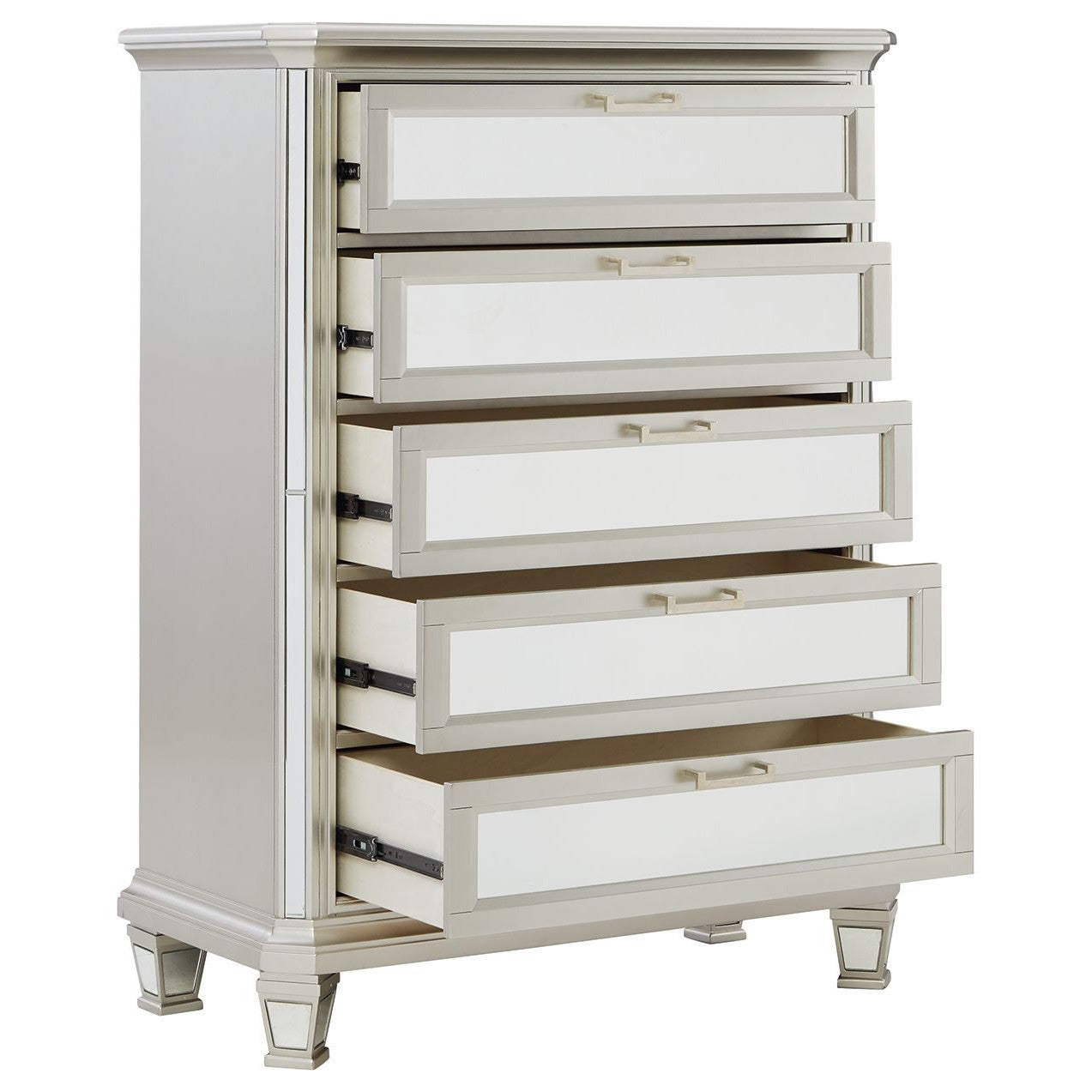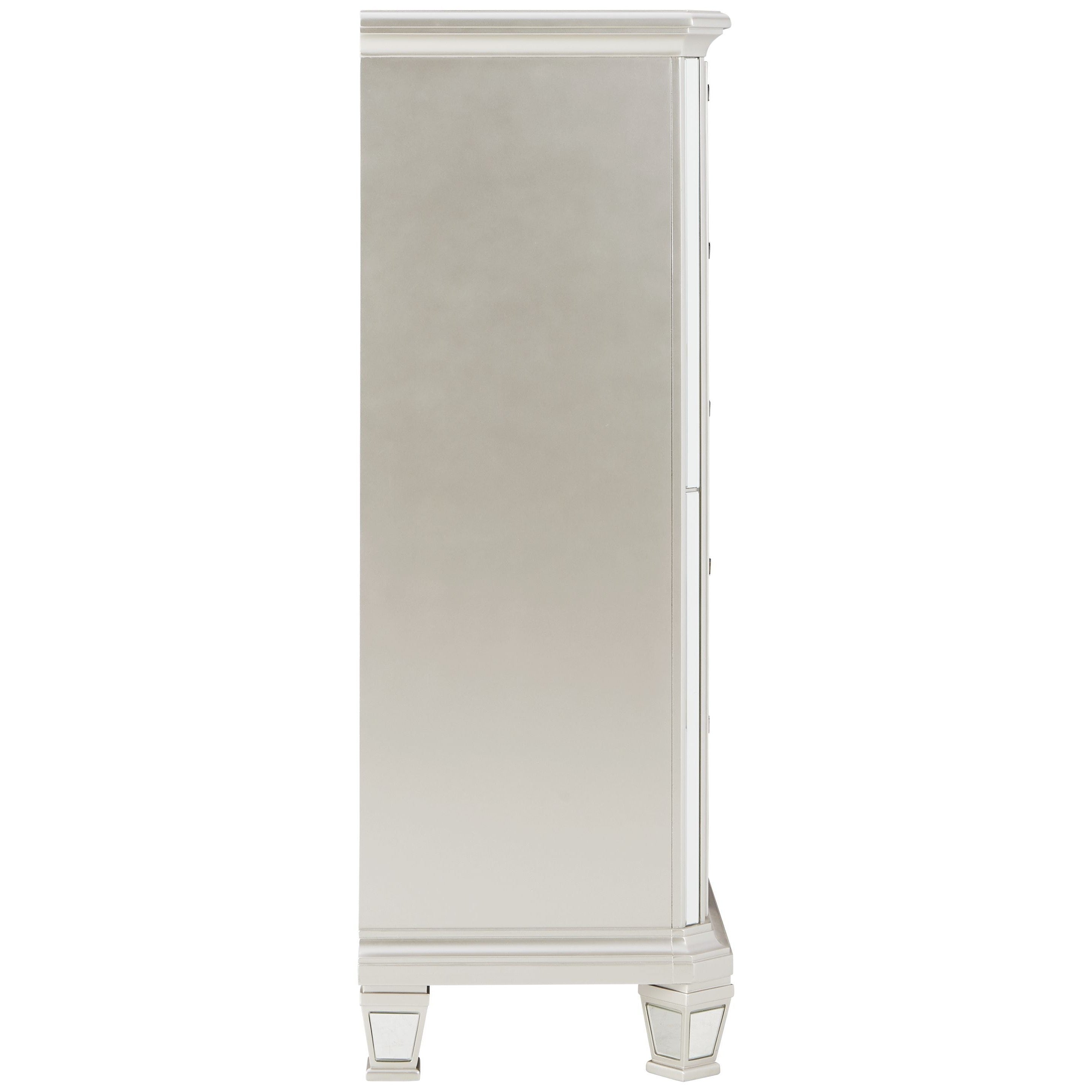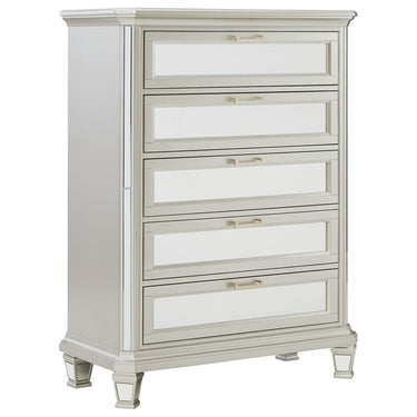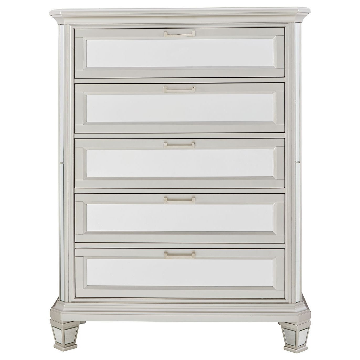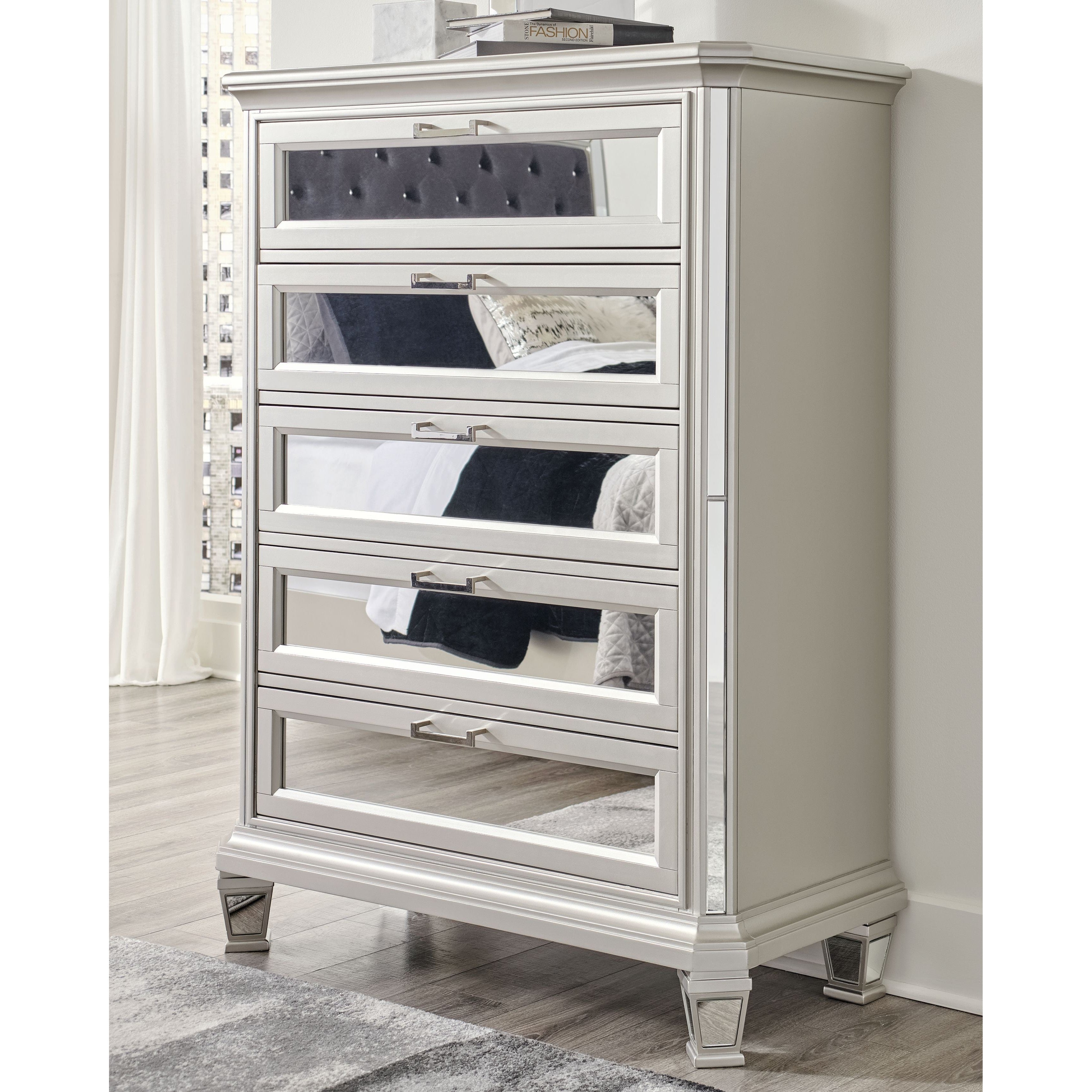 Seamlessly complete your bedroom with this striking Lindenfield chest of drawers. Its metallic silvertone finish is bold on its own, while inset beveled mirror accents take this dynamic piece to the next level. Five smooth-gliding drawers allow for the perfect balance of function and forward-thinking design.