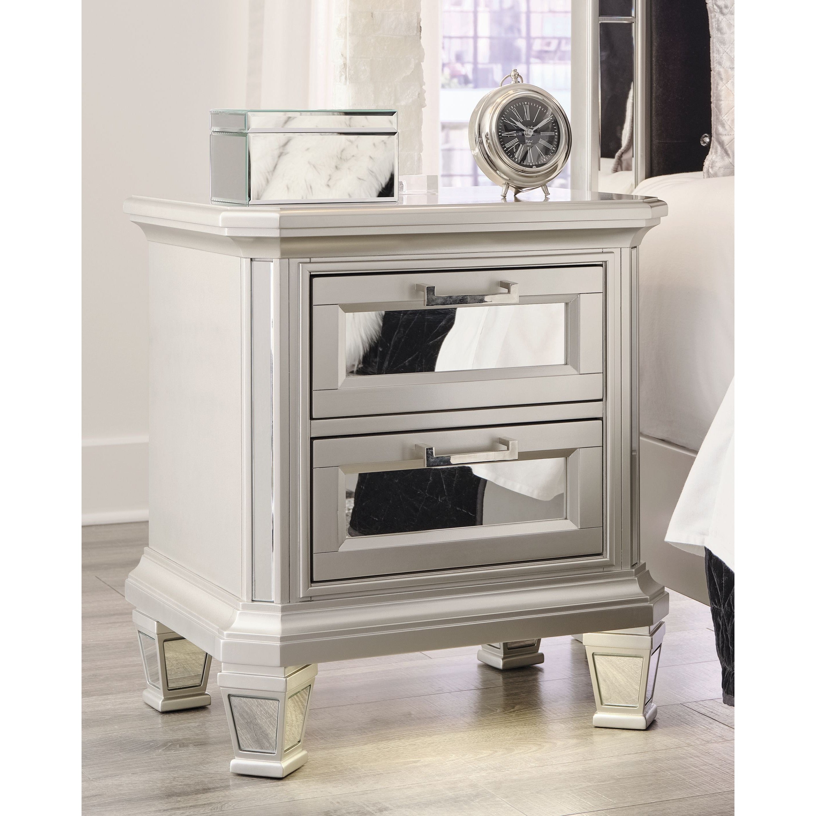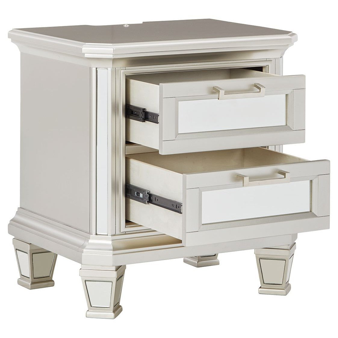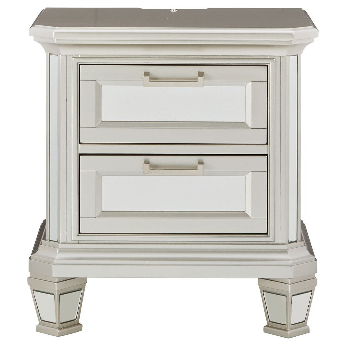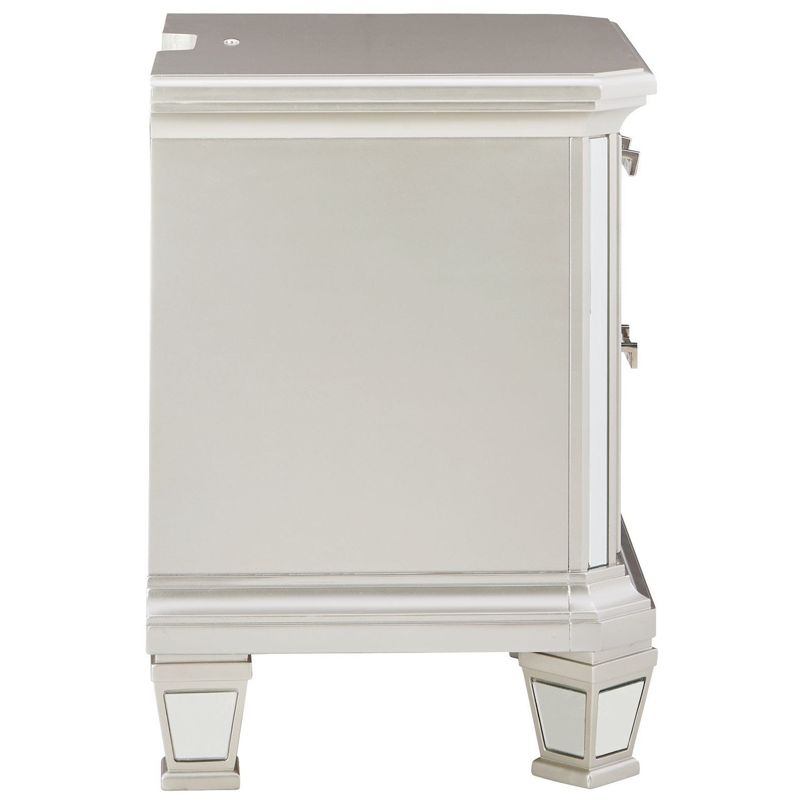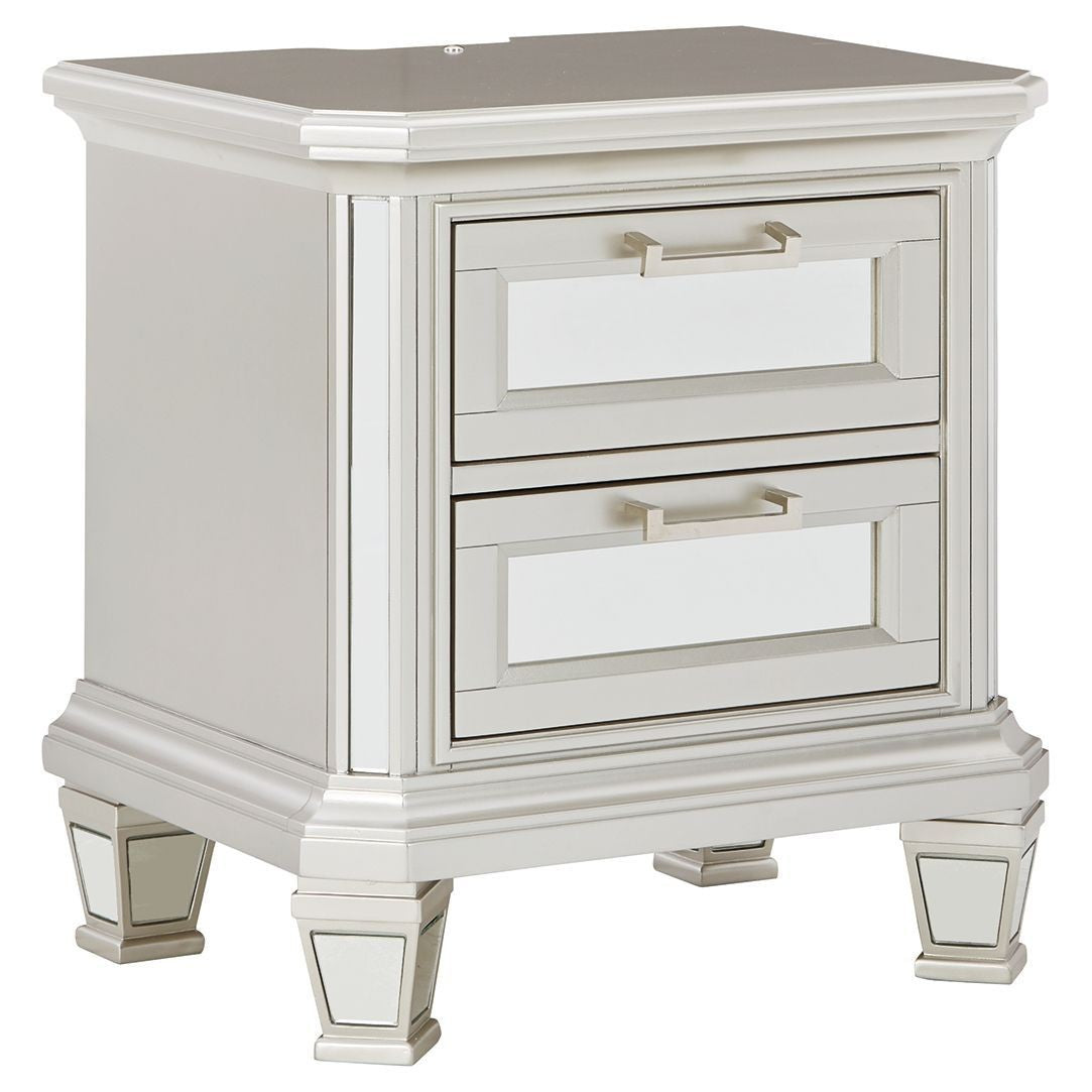 Seamlessly complete your bedroom with this striking nightstand. Its metallic silvertone finish is bold on its own, while inset beveled mirror accents on the smooth-gliding drawers take this dynamic piece to the next level. An LED nightlight and dual USB charging ports allow for the perfect balance of function and forward-thinking design.