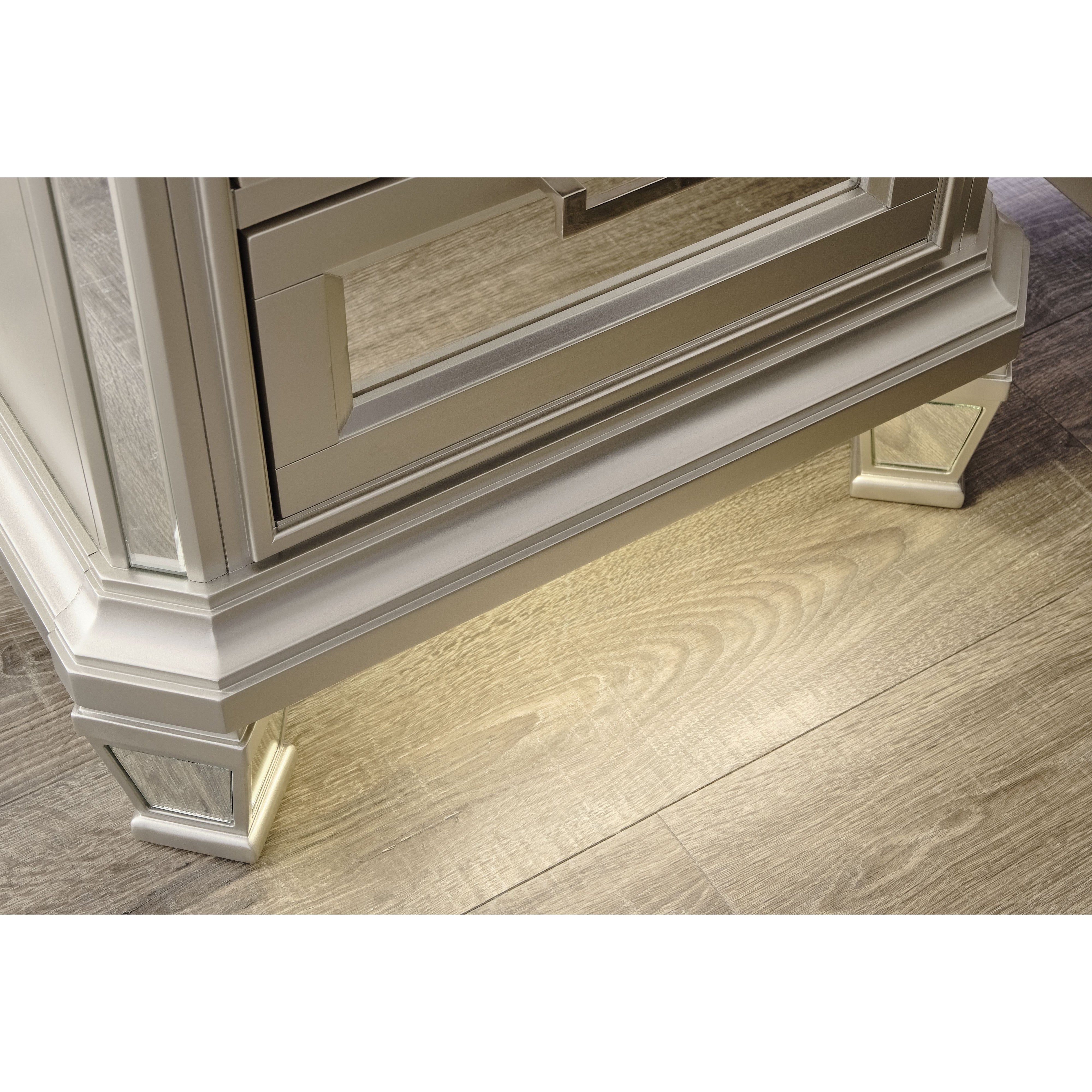 - Metallic silvertone finish with inset beveled mirror accents