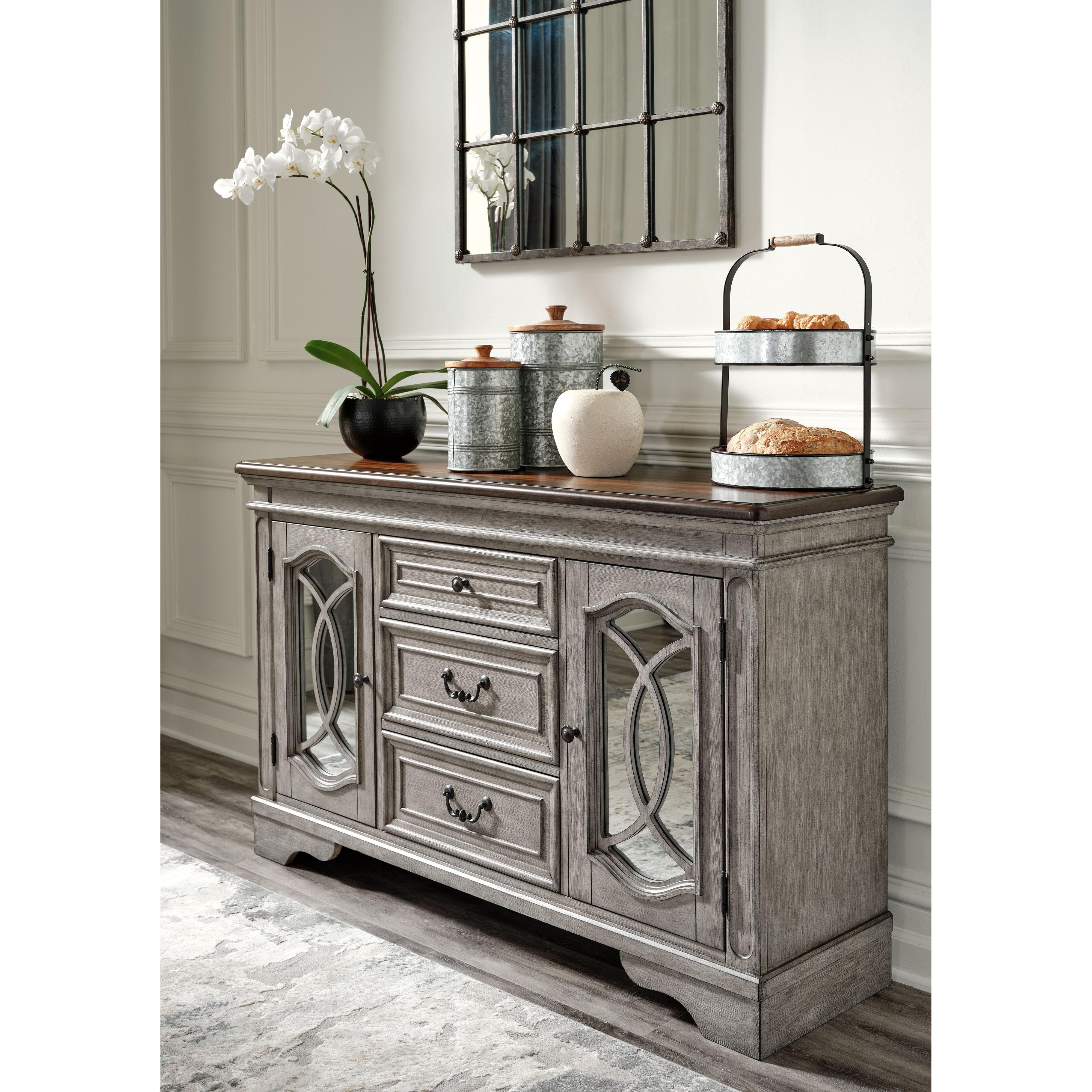 Serve up a sense of traditional cottage design with this dining room server. It features a pair of cabinet doors with inset mirrored glass and decorative fretwork. The server's three smooth-gliding drawers with dovetail construction and black felt bottoms are perfect for storing more delicate items. An antiqued gray body and rich deep walnut brown top, along with bail pulls and knobs finished in a dark bronze tone, complete the beautiful design.