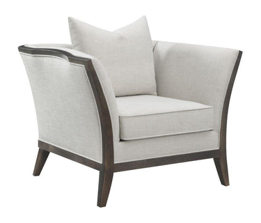 Relax in a den or living space with this transitional beige and wood accent chair, an inspiring choice for delivering neutrality. flared shelter arms featuring a subtle curved inset frame and a reversible bench seat cushion offers a comfortable seating venue. coffee finish wood trim creates shaping that contrasts with soft beige fabric, as an eco-friendly and animal friendly trillium blend fill pillow adds luxury. this versatile chair becomes an integral element in easy-living casual fare. coordinate with matching pieces or choose as a solo seat in a smaller space.