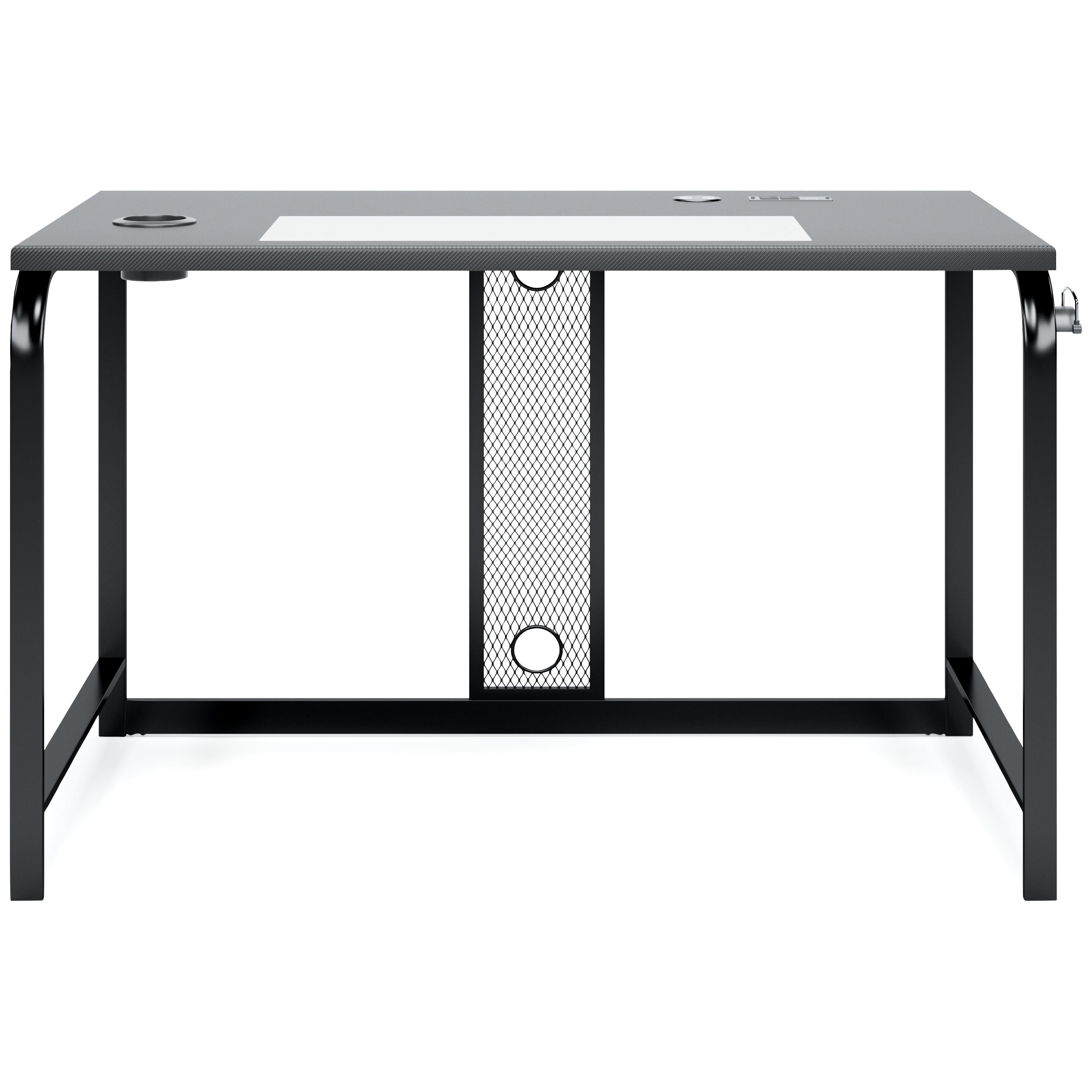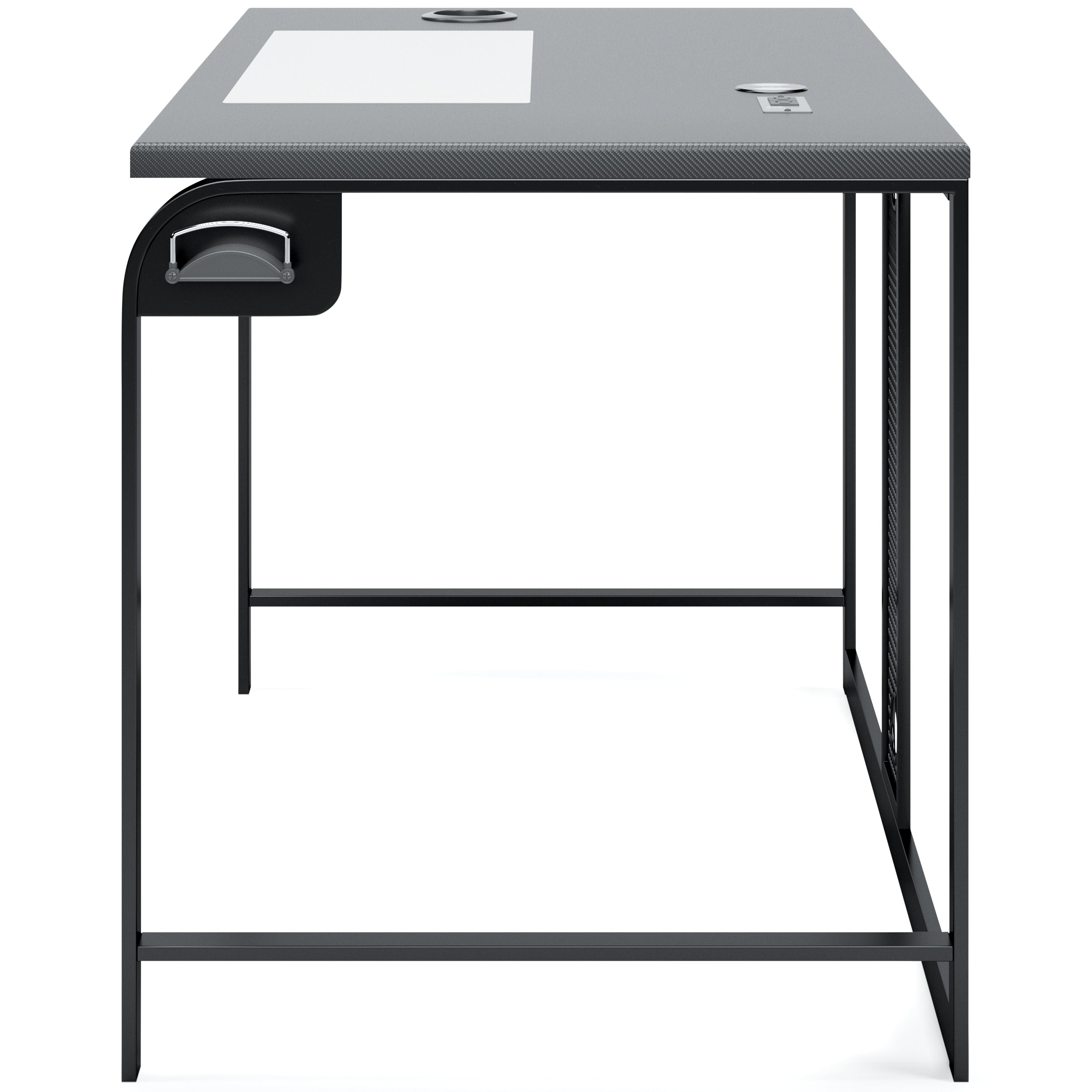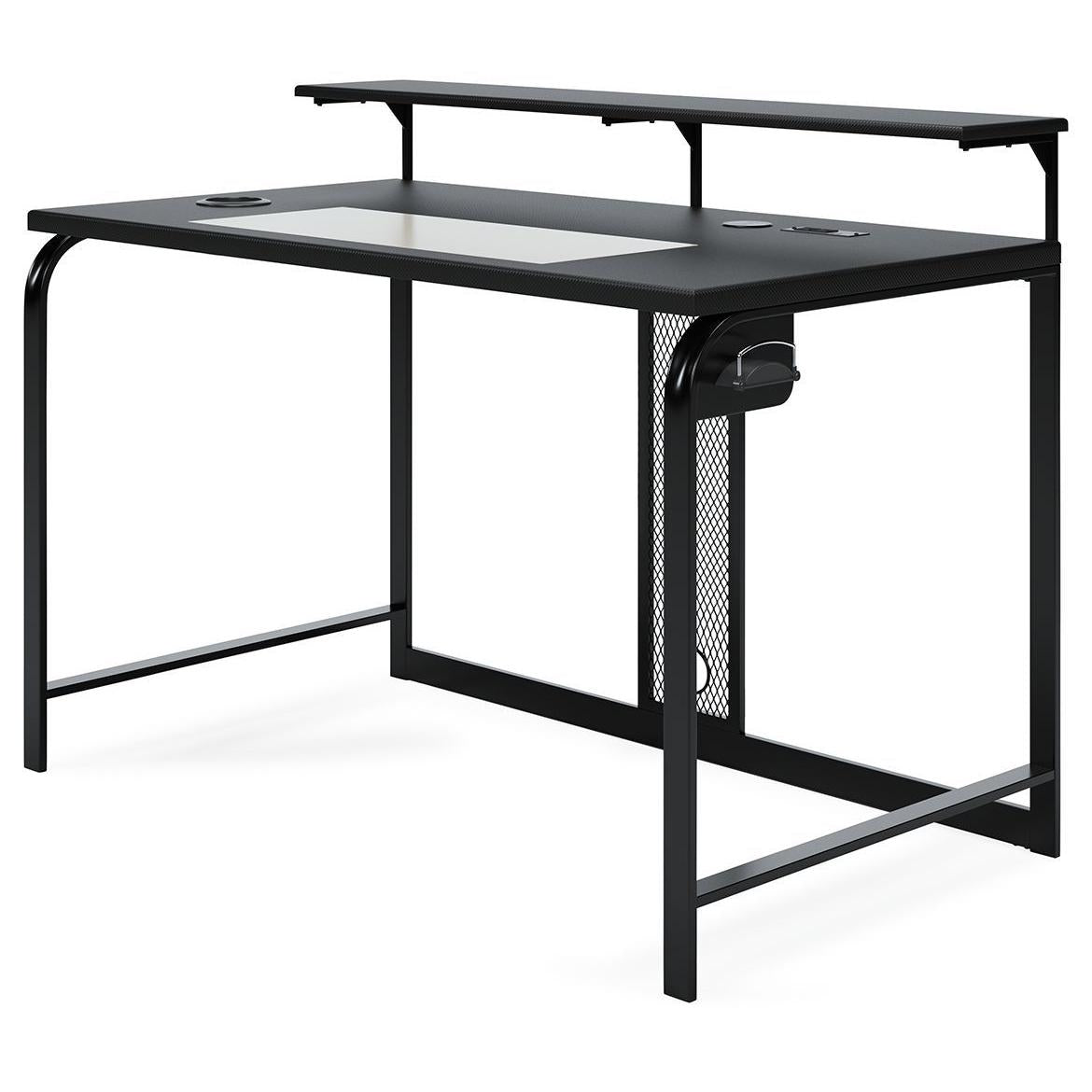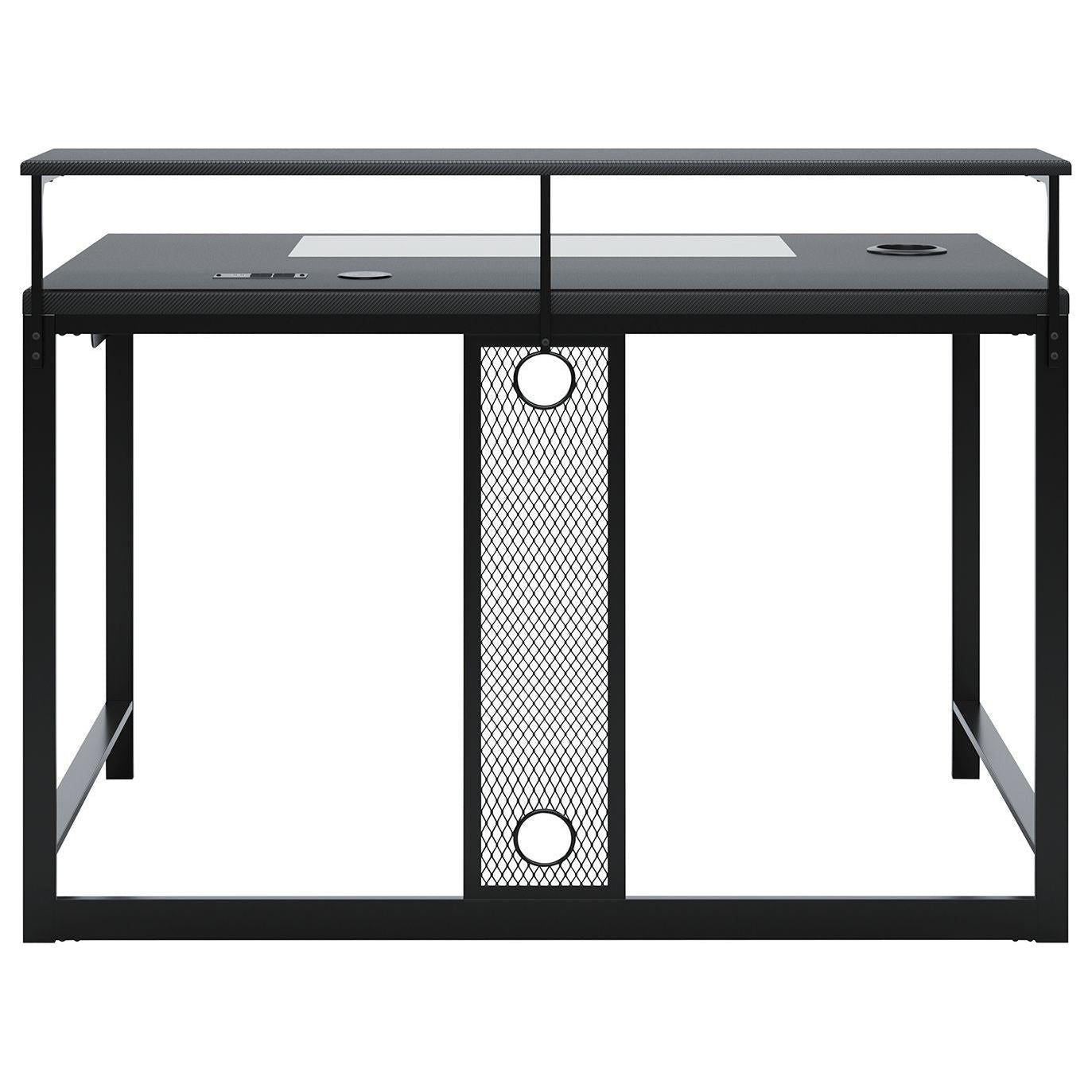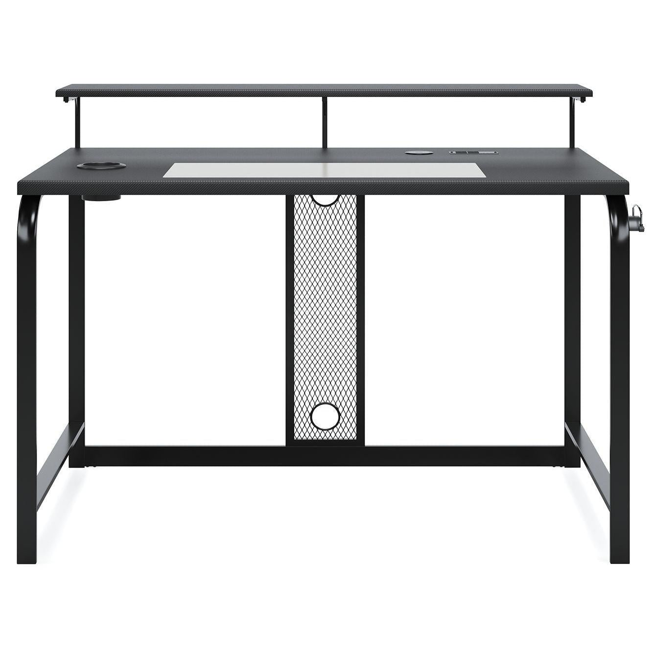Ultra mod. Work smarter-and look cool doing it-with the new-age efficiency of this desk. Its streamlined design is accented with a tech-inspired decorative laminate surface and PVC insert for mouse tracking. This super sleek yet fully loaded home office desk includes a raised monitor stand with LED ambient lighting, a headset hanger conveniently mounted on the side and a mesh modesty panel underneath for managing all your cords. And with an integrated cup holder, wireless Qi charger and 110V power supply with dual USB ports for charging all your devices, this desk really is designed to keep you up and running.