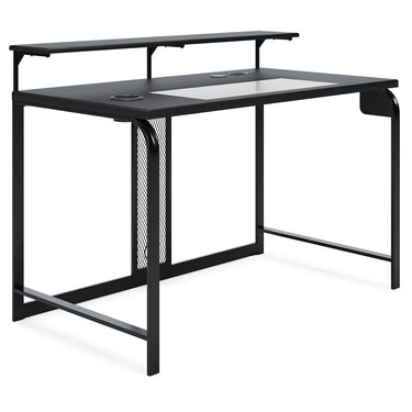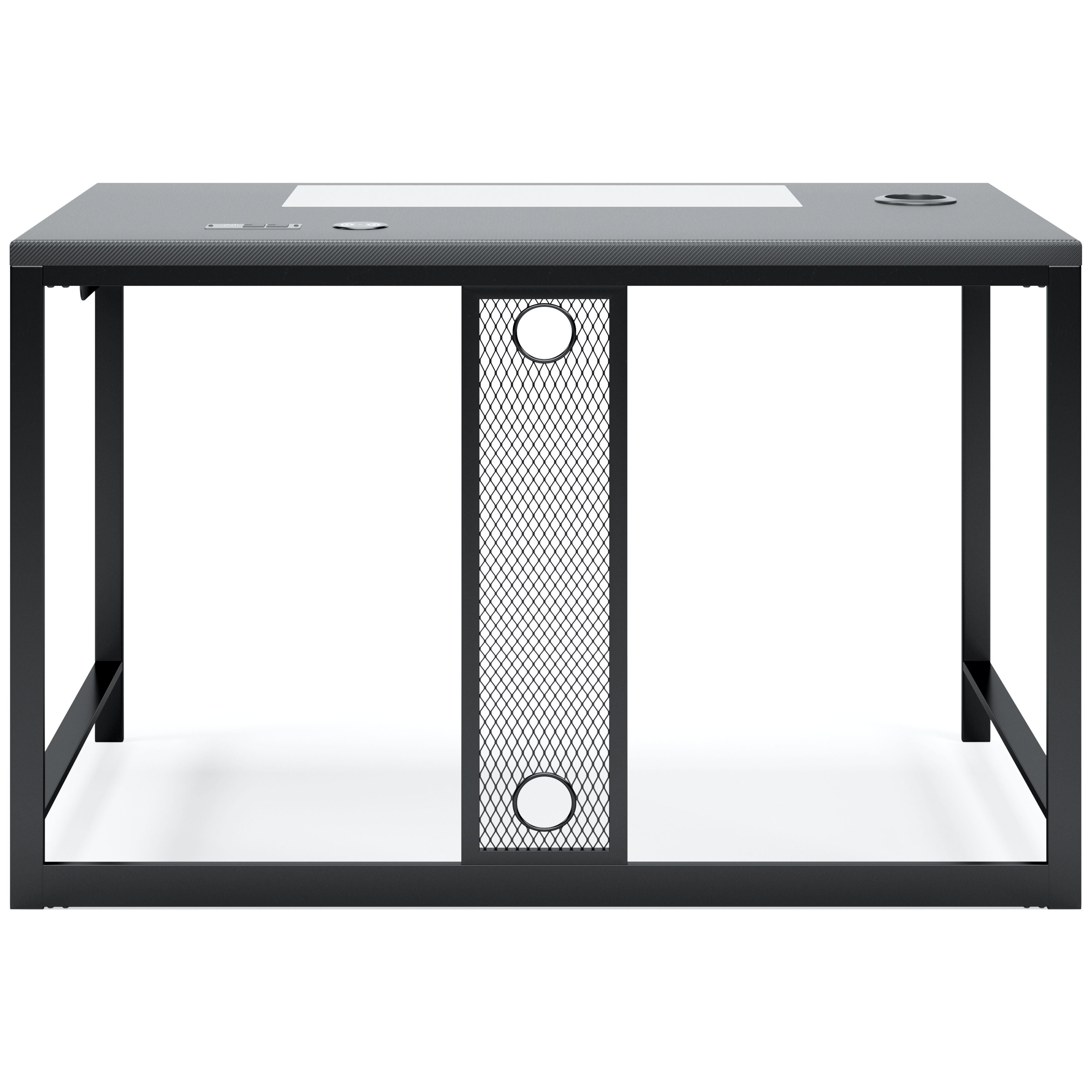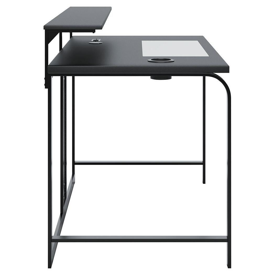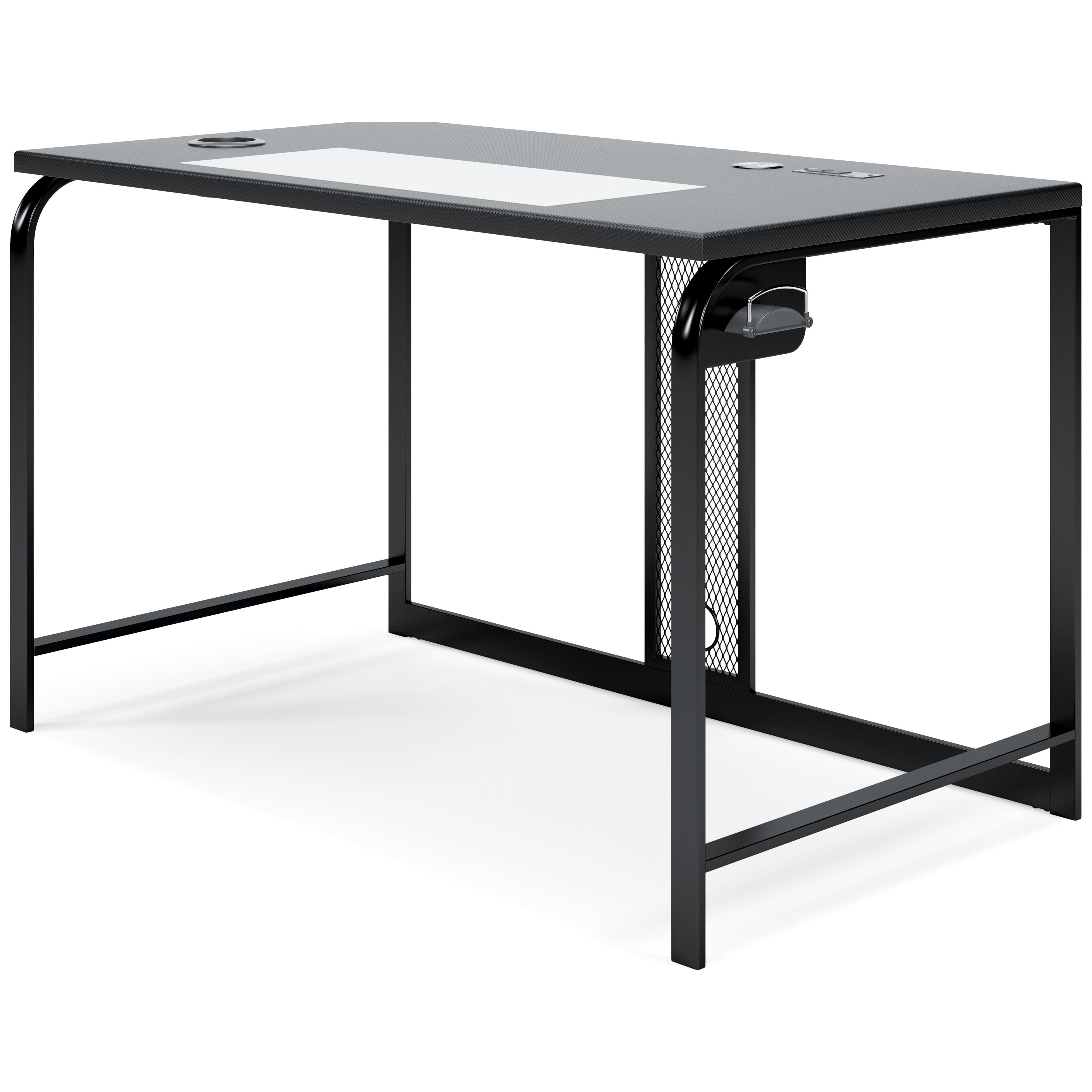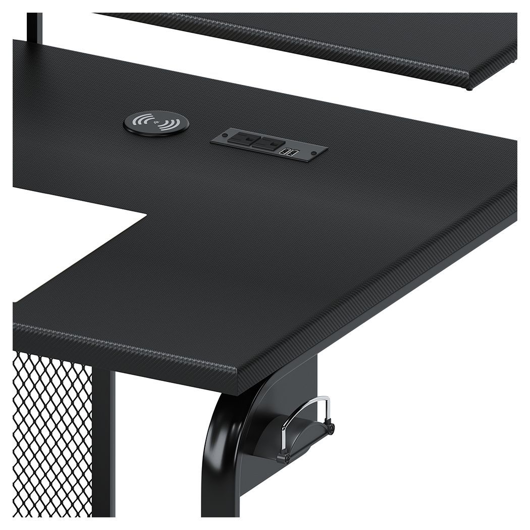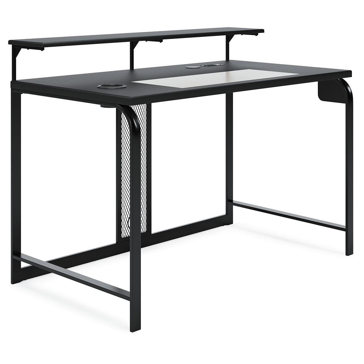 Ultra mod. Work smarter-and look cool doing it-with the new-age efficiency of this desk. Its streamlined design is accented with a tech-inspired decorative laminate surface and PVC insert for mouse tracking. This super sleek yet fully loaded home office desk includes a raised monitor stand with LED ambient lighting, a headset hanger conveniently mounted on the side and a mesh modesty panel underneath for managing all your cords. And with an integrated cup holder, wireless Qi charger and 110V power supply with dual USB ports for charging all your devices, this desk really is designed to keep you up and running.