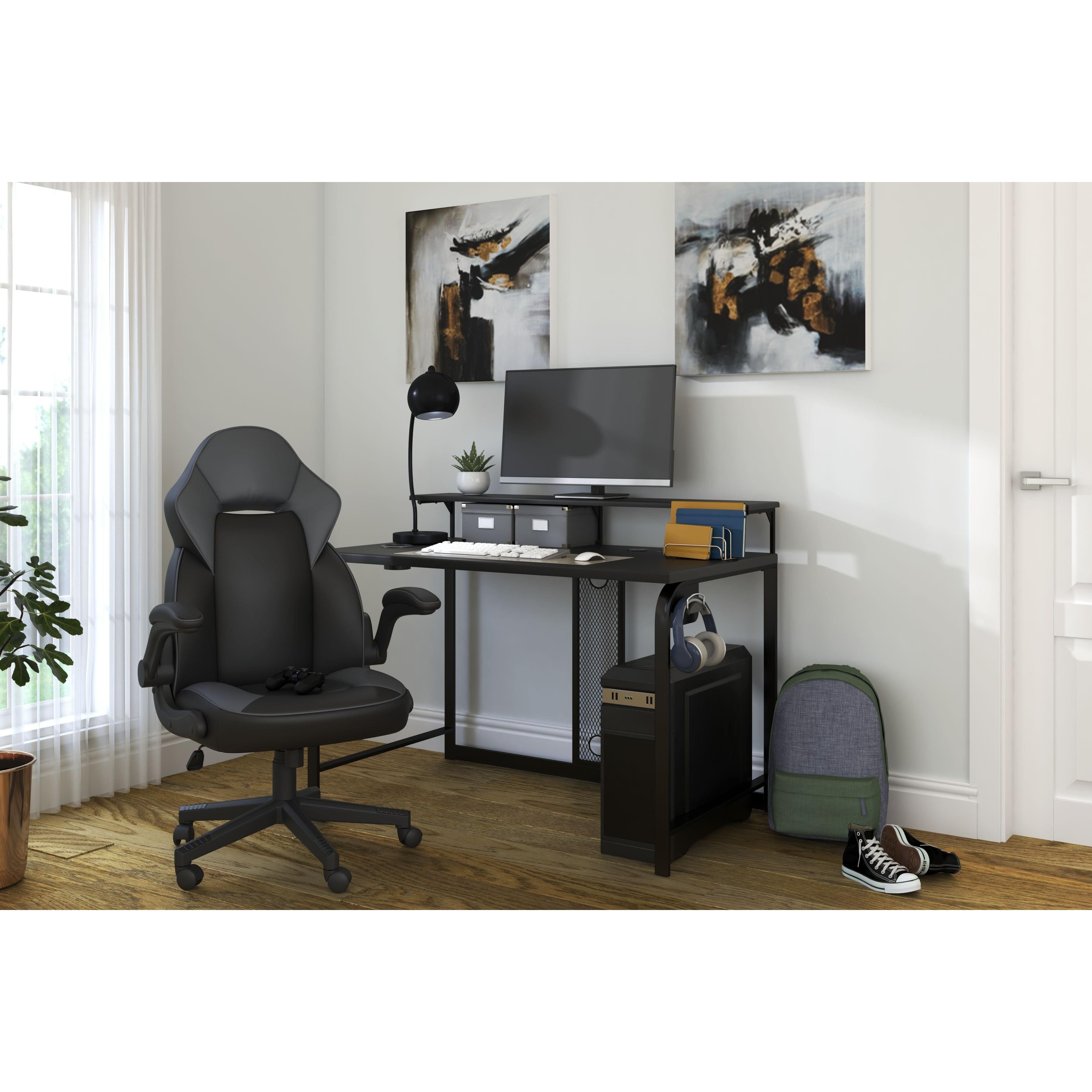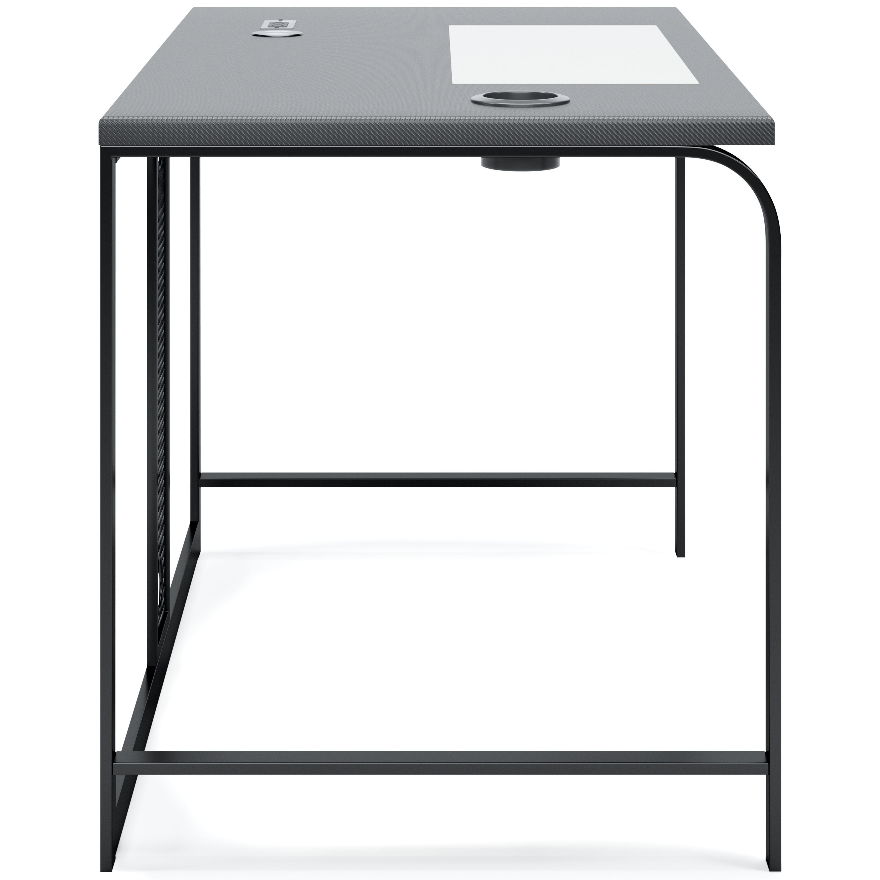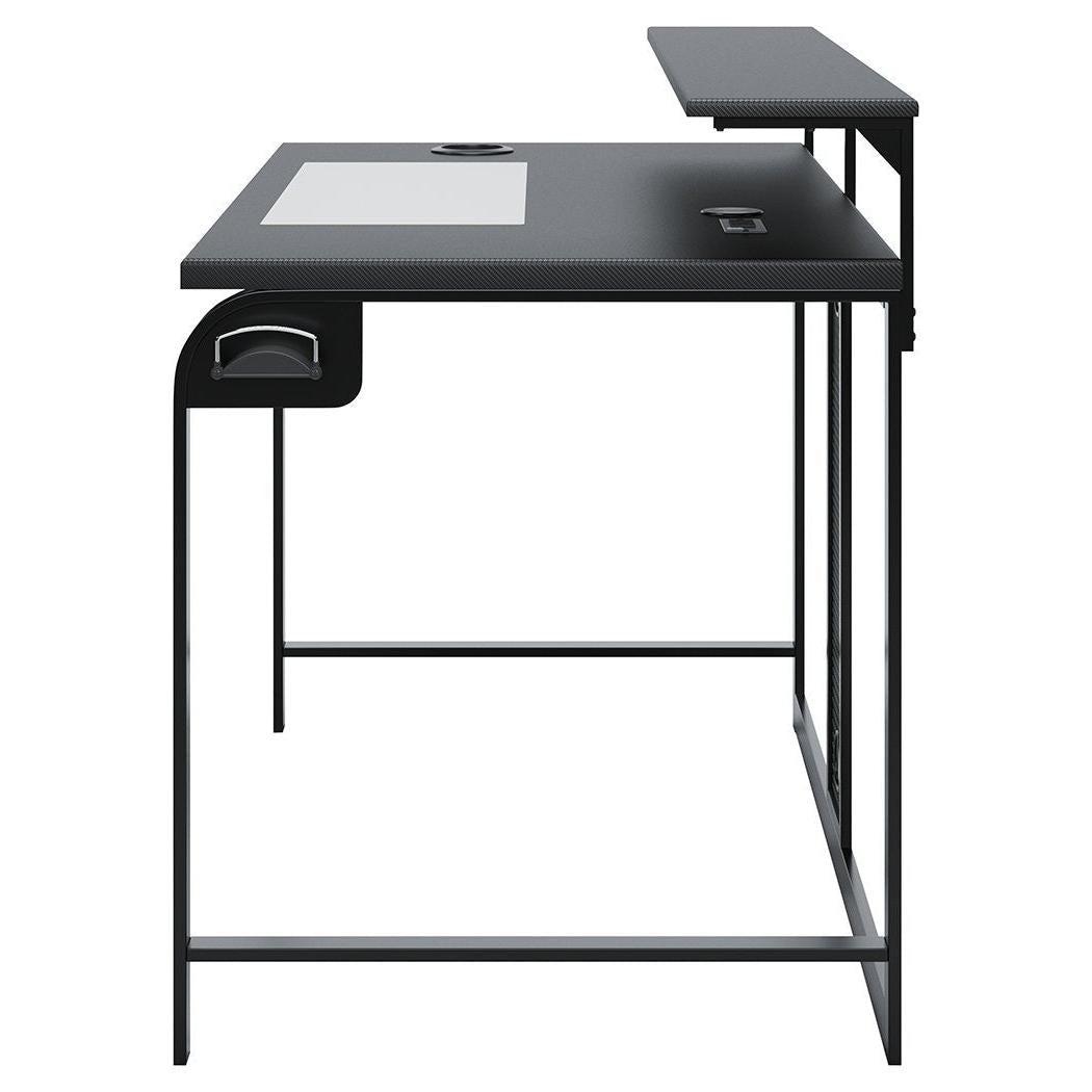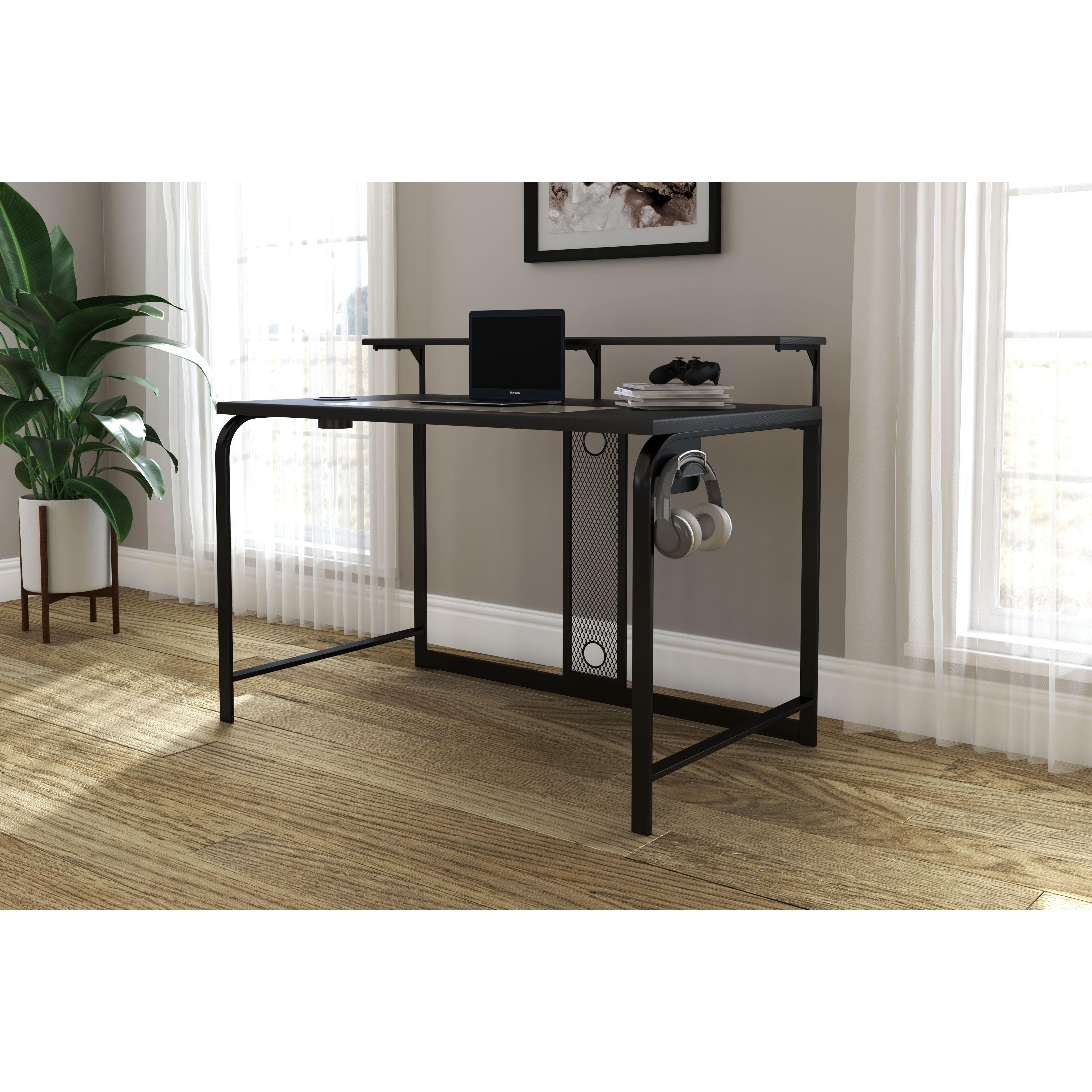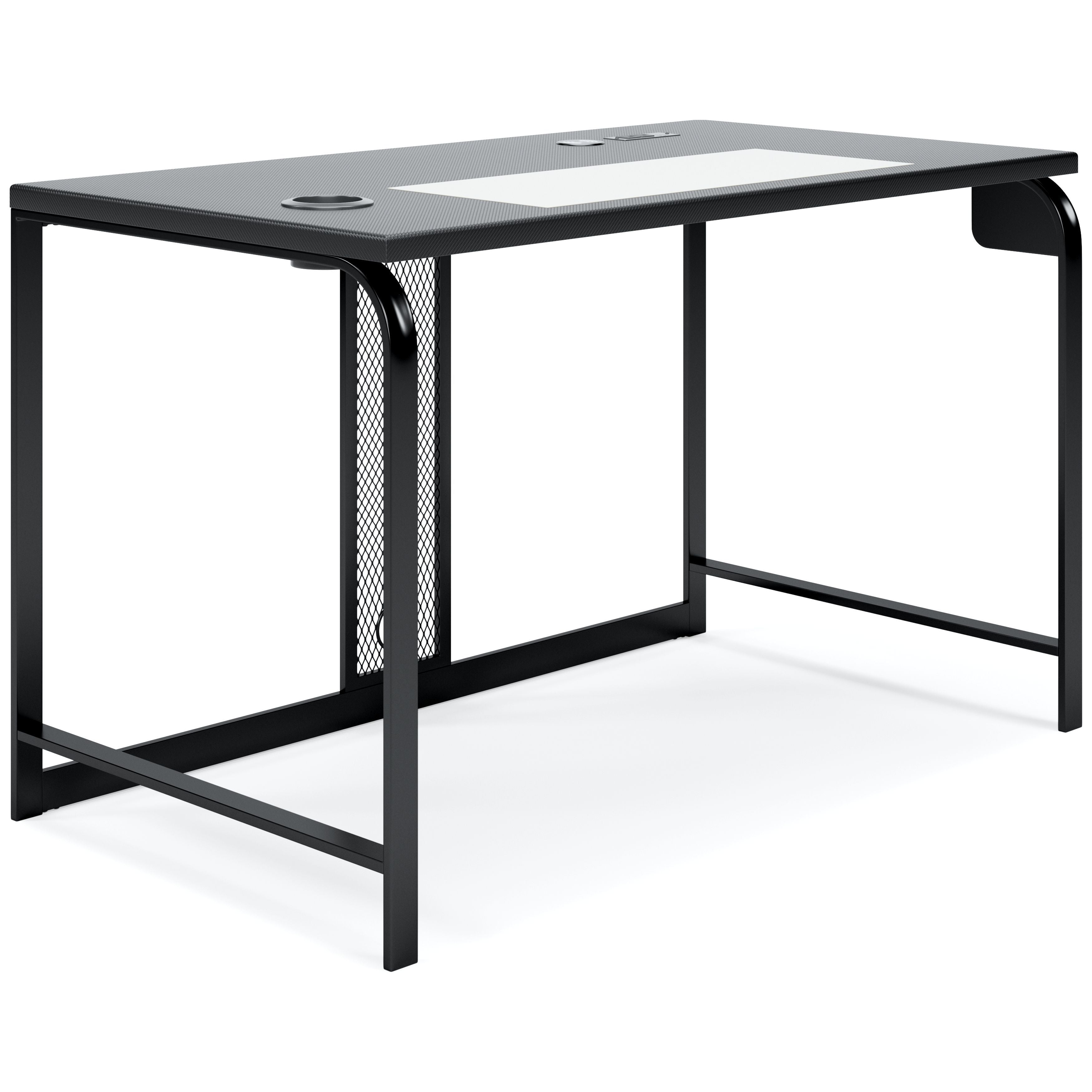 Ultra mod. Work smarter-and look cool doing it-with the new-age efficiency of this desk. Its streamlined design is accented with a tech-inspired decorative laminate surface and PVC insert for mouse tracking. This super sleek yet fully loaded home office desk includes a raised monitor stand with LED ambient lighting, a headset hanger conveniently mounted on the side and a mesh modesty panel underneath for managing all your cords. And with an integrated cup holder, wireless Qi charger and 110V power supply with dual USB ports for charging all your devices, this desk really is designed to keep you up and running.