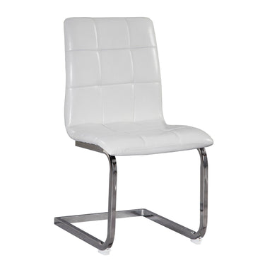 Wowing with a slim but sturdy profile and sculptural C-frame design, this dining room upholstered chair is sure to whet your appetite for ultra-contemporary style. Comfortably contoured seat is covered in a fabulous white faux leather with subtle grid tufting. Metal frame's chrome-tone finish contrasts with a high-sheen effect.