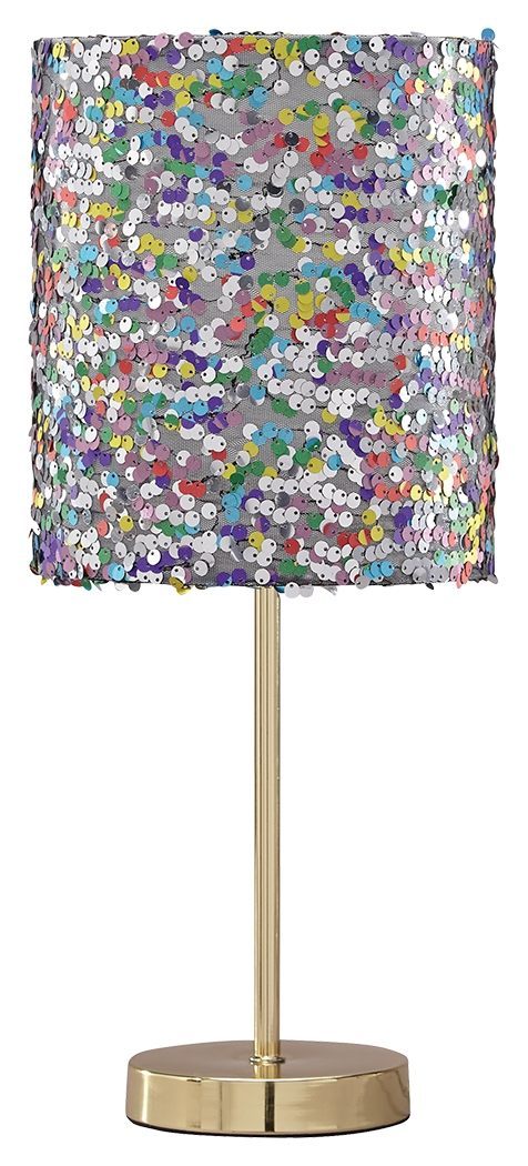 Is your little one all about the glam factor? If so, she'll love this table lamp. Multicolored sequined drum shade lights up her room in style. Goldtone metal base is a classy touch to this glitzy design.