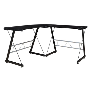 Bring a midtown feel to your office with this L-desk. The three-piece modular desk can easily transform a small space or spare bedroom into a stylish work-from-home environment. With a satin black powder coated finish and contrasting chrome-tone stretchers, this desk makes a bold statement while providing ample work space.
