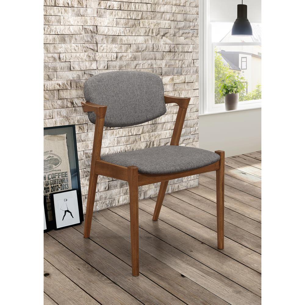 Part of the malone collection, a classically designed contemporary chair to pull up to your modern dining table from the same collection. seat back hovers independent of the seat, connected by sharply styled arm rest. seat and back upholstered in deluxe grey fabric. legs finished in dark walnut. acutely angled back legs combine with straight front legs for a rebelliously impressive silhouette.
