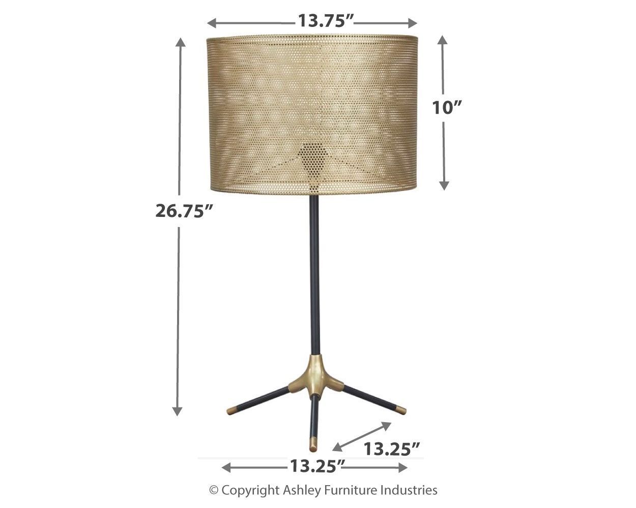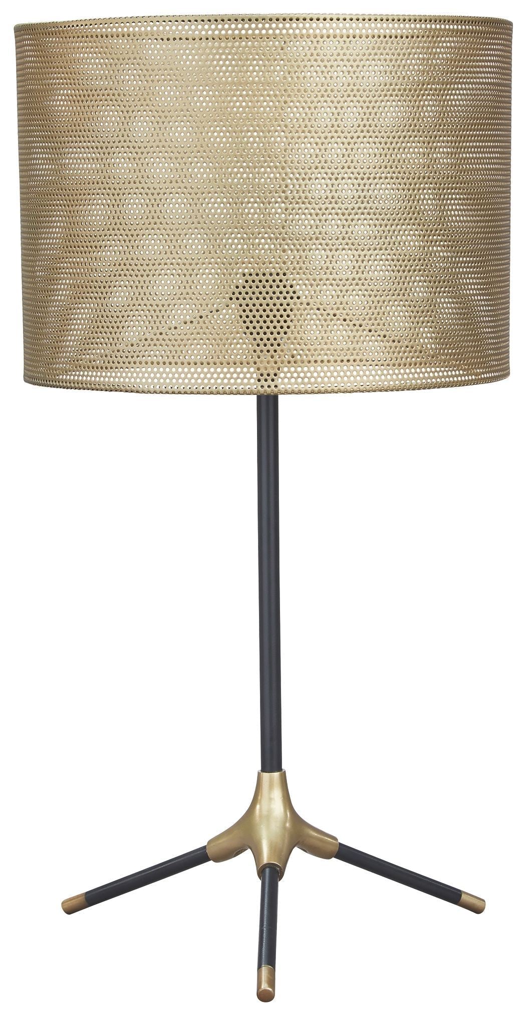 This table lamp pays homage to mid-century design. Combination of brass-tone and gunmetal-color finishes entices you in urban contemporary expression. Light shines beautifully through the mesh-inspired metal shade. Propped on a three-leg base for thrice the style.