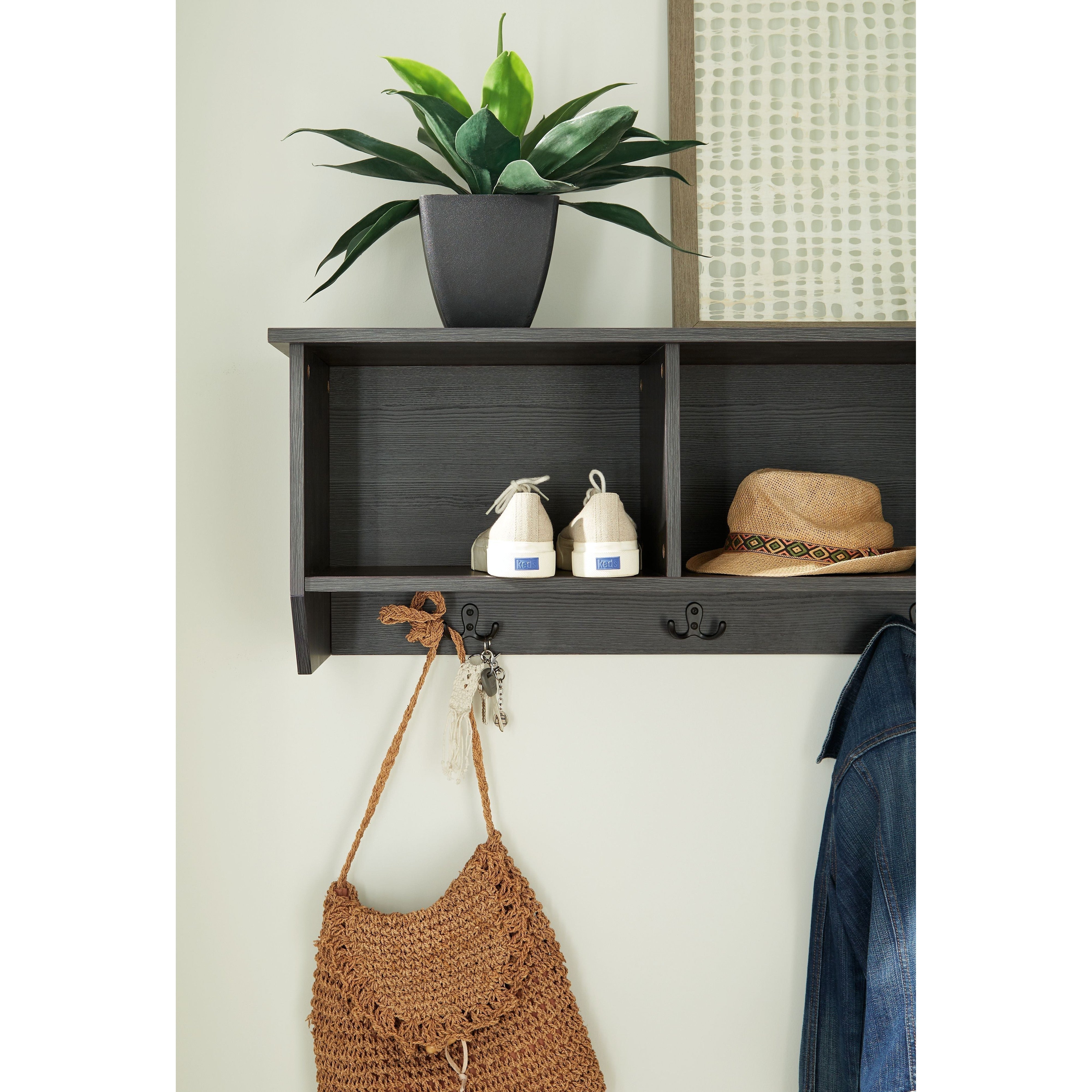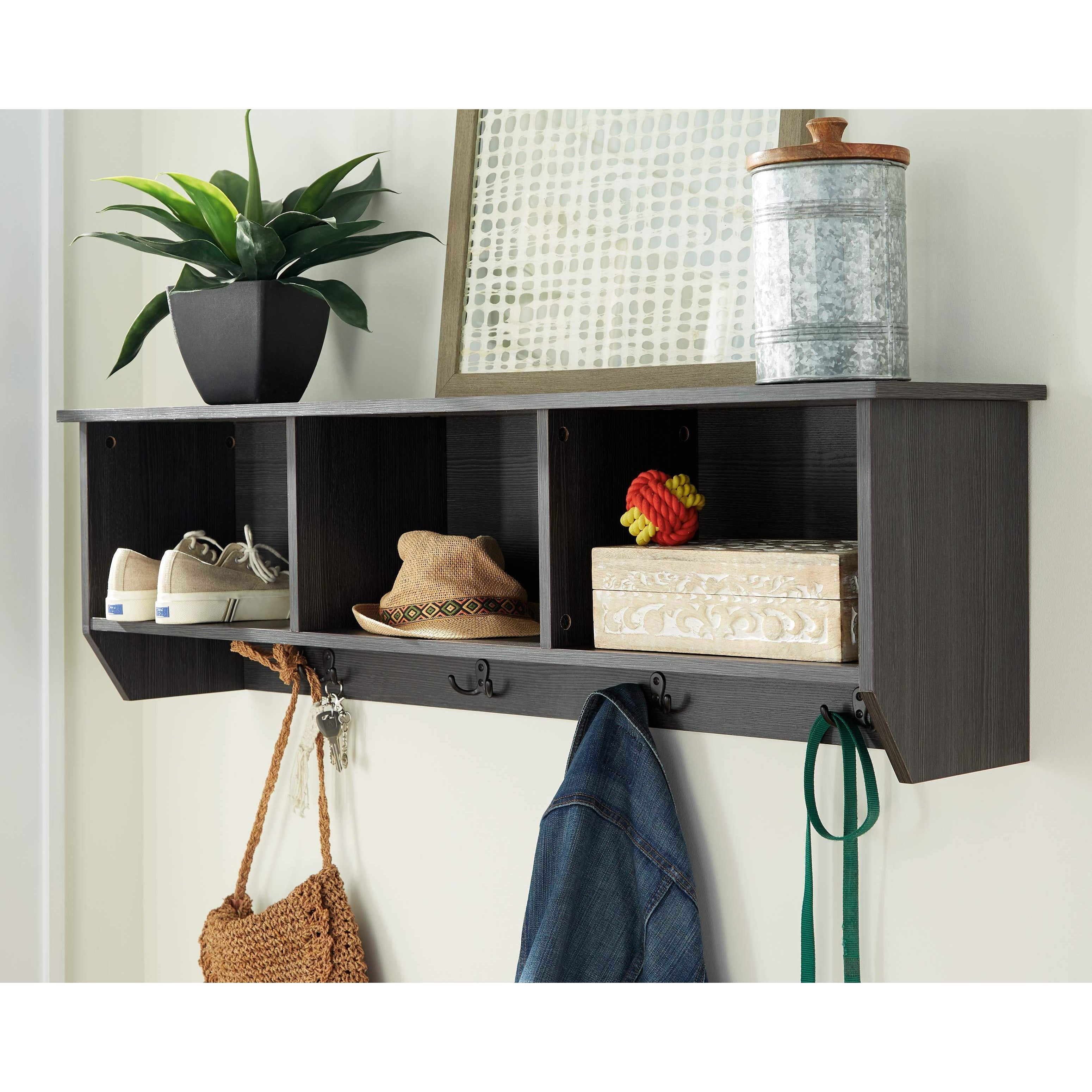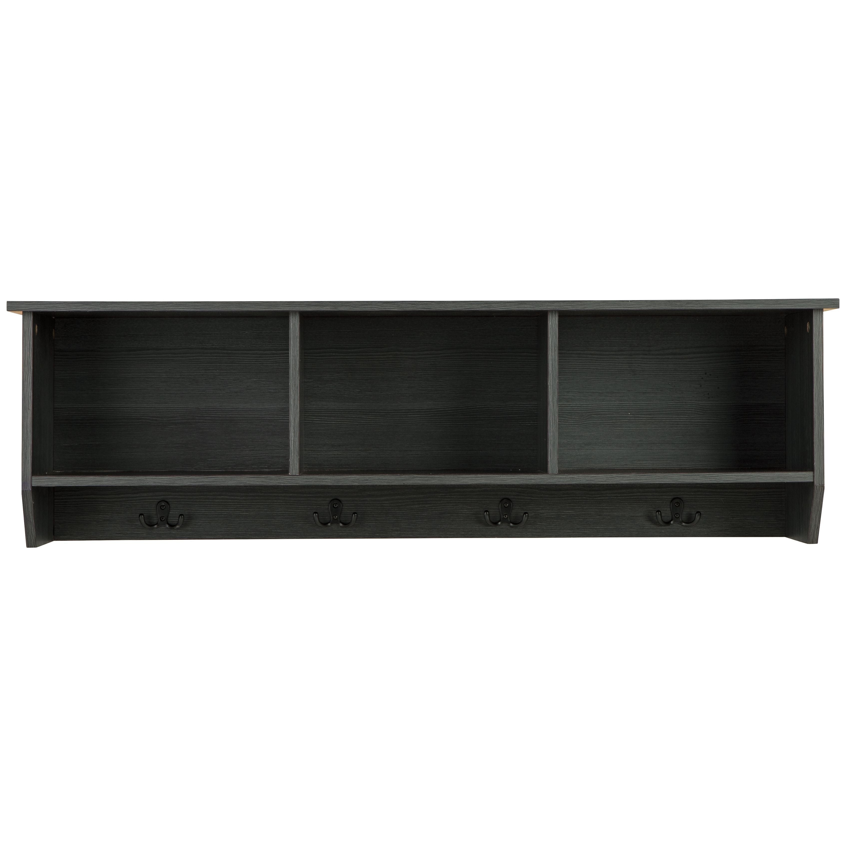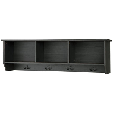 Short on organization? Look no further than this space saving wall-mount shelf. The antiqued gray finished wood brings warmth to any room, while the four hooks make storage of coats and other accessories a breeze.