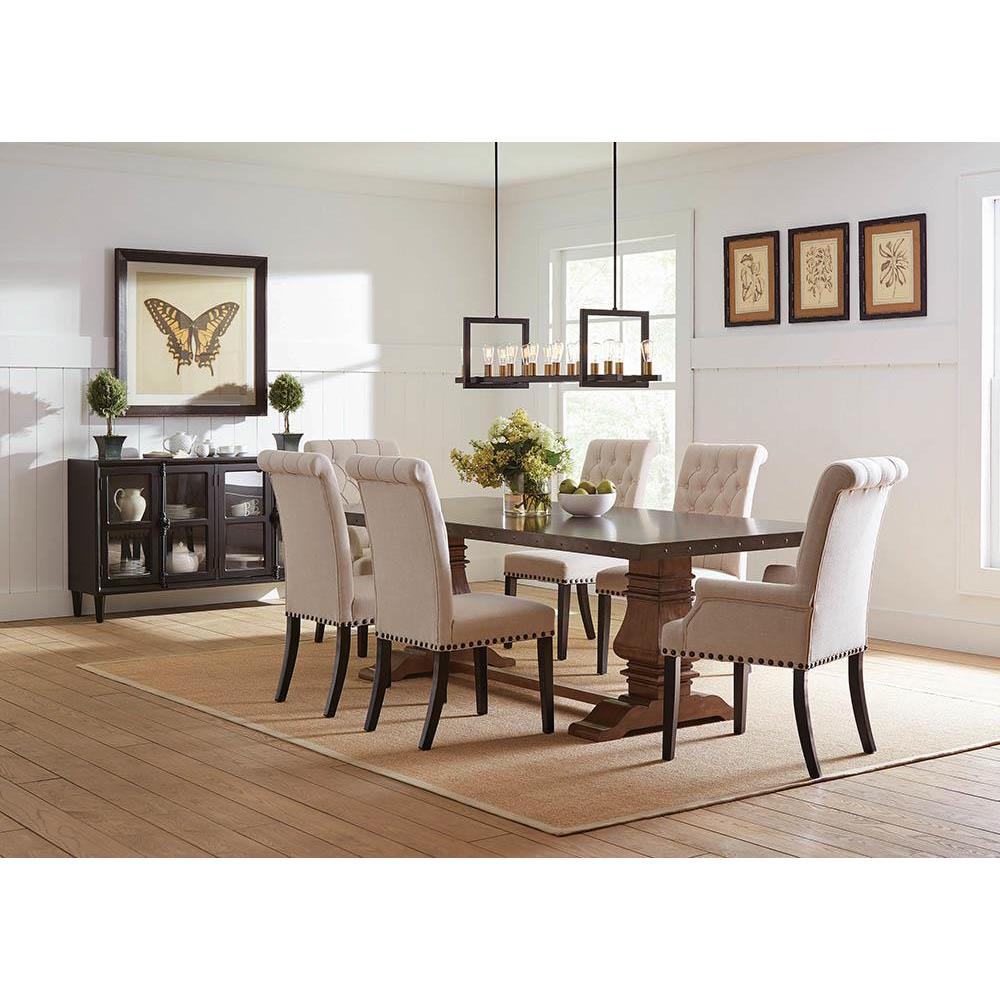 Airy elegance adds a charming touch in a semi-casual space. this dining chair celebrates style with a lovely cream fabric upholstery. linear design offers an armless profile with tapered legs. a tufted seat back and nailhead trim build its personality with a touch of character. contrast created by deep finish legs shapes the decor allure of this exceptional dining chair.