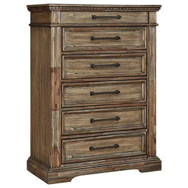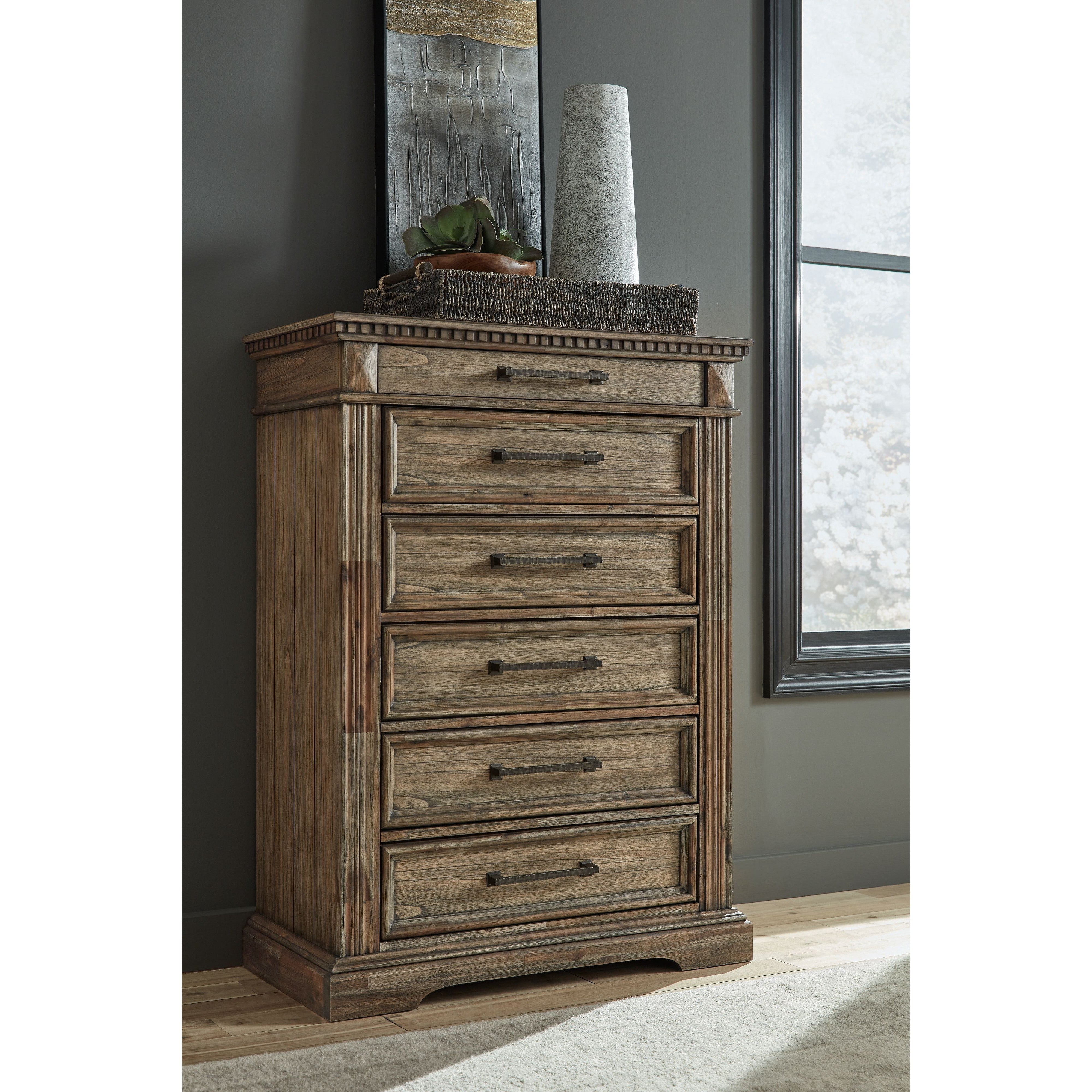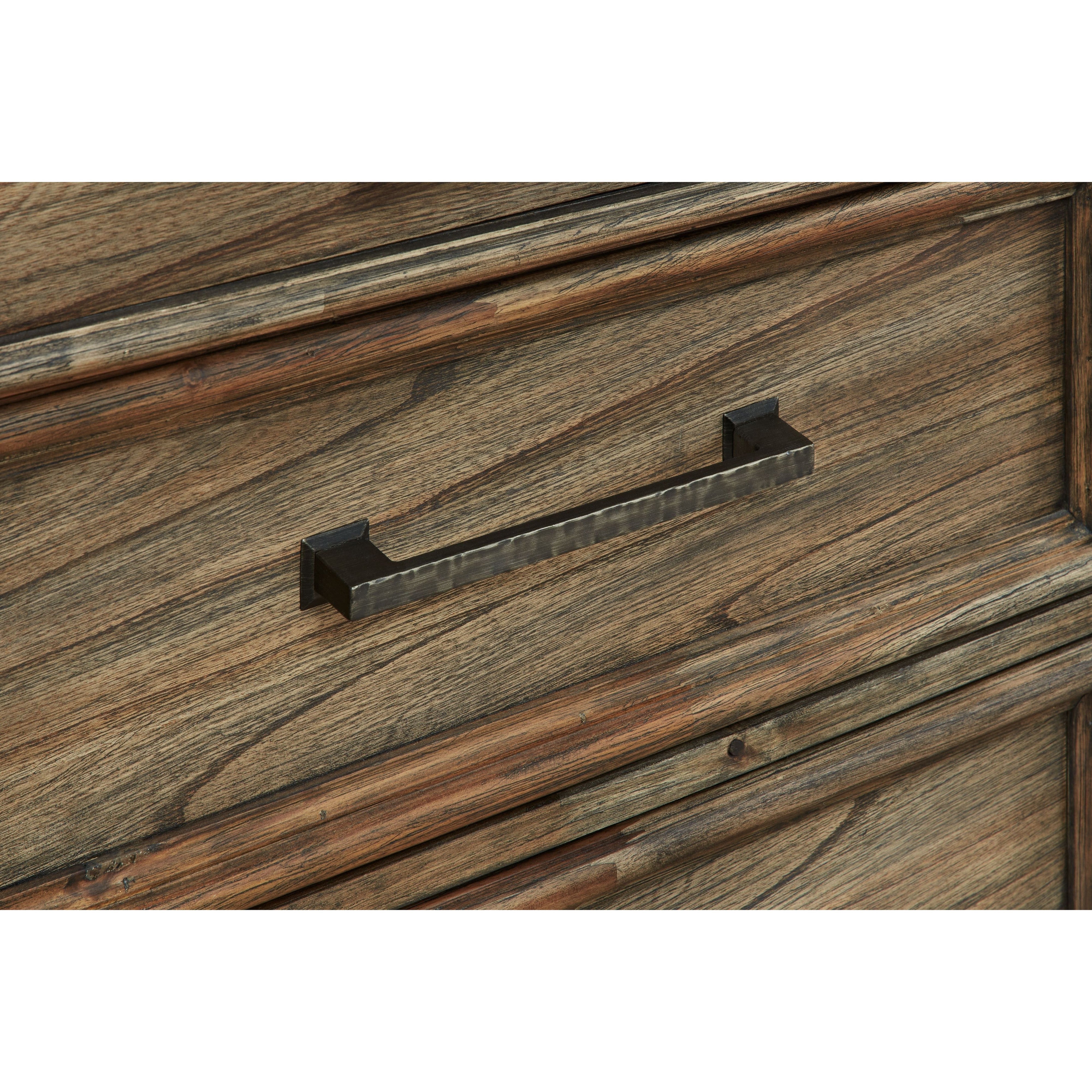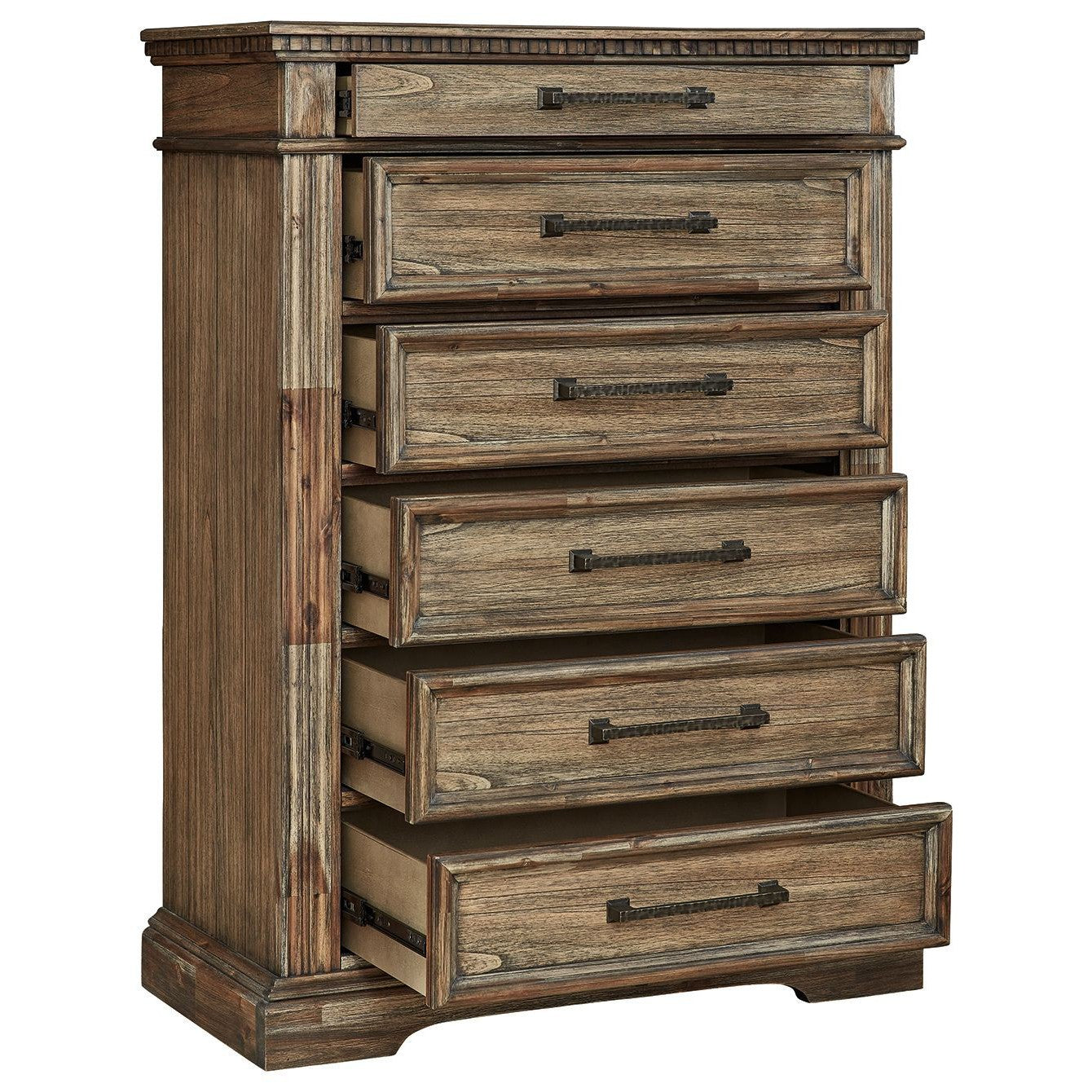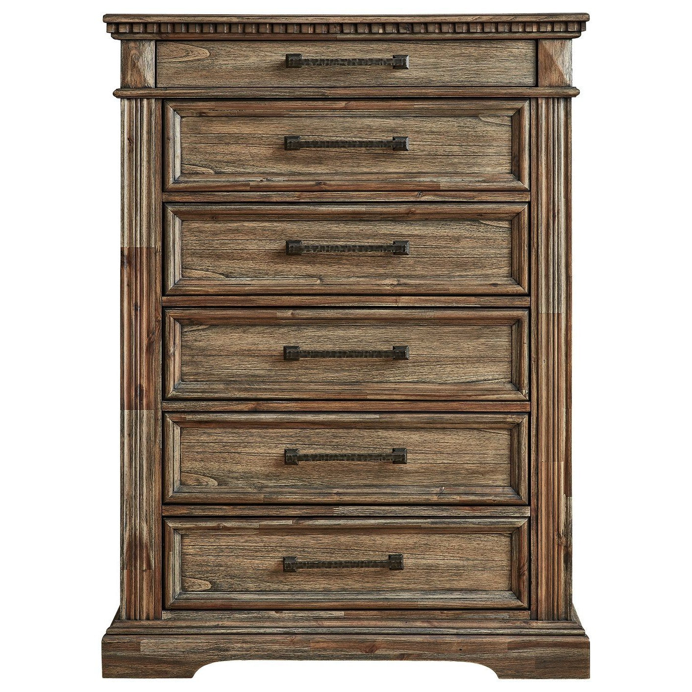 Curate a vintage-inspired retreat from the modern world without setting foot in a flea market. This chest of drawers is draped in a dreamy finish that enhances the wood's character, while dark pewter-tone bar pulls on smooth-gliding drawers have a hammered feel. Fluted details and robust breakfront crown molding provide picturesque finishing touches.