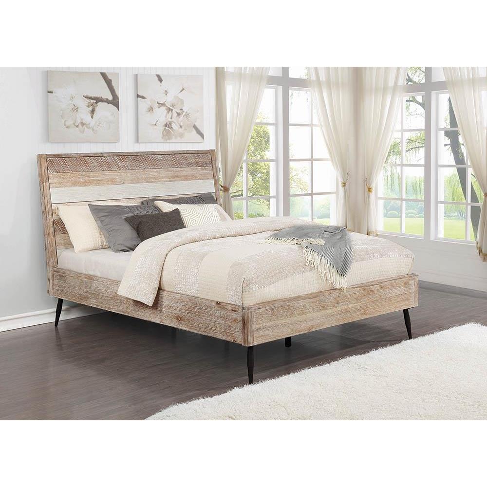 With a rustic, hand-rubbed finish in lovely, natural tones, this wooden platform bed exudes classic appeal. flared metal legs in a matte black finish enhance its appearance with a cool, industrial edge. crafted for quality, its durable frame is made with acacia wood, mdf, and plywood. a fully-slatted platform design offers hours of comfortable support. combined with matching bedroom furniture, this wooden bed completes a master suite or guest room in style.