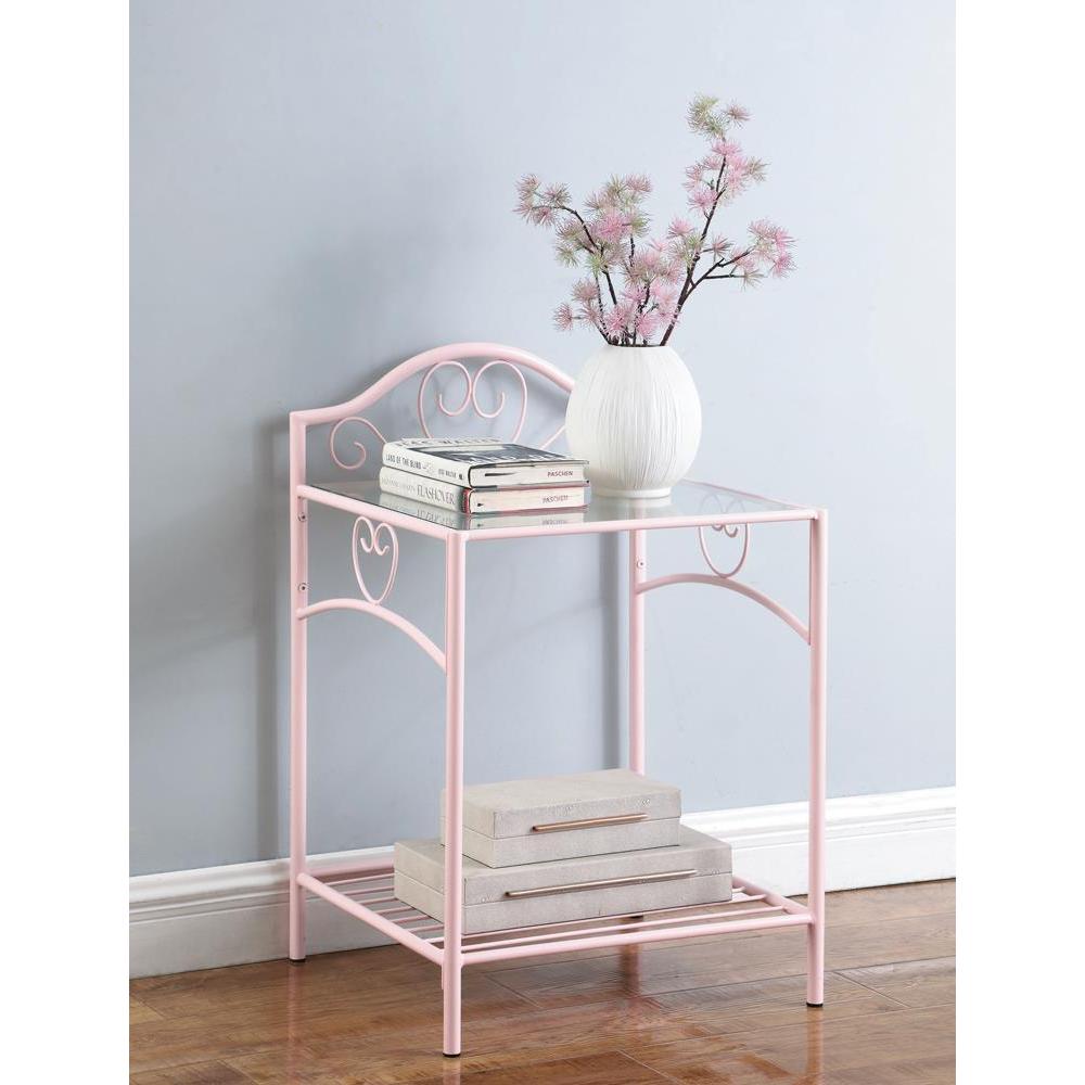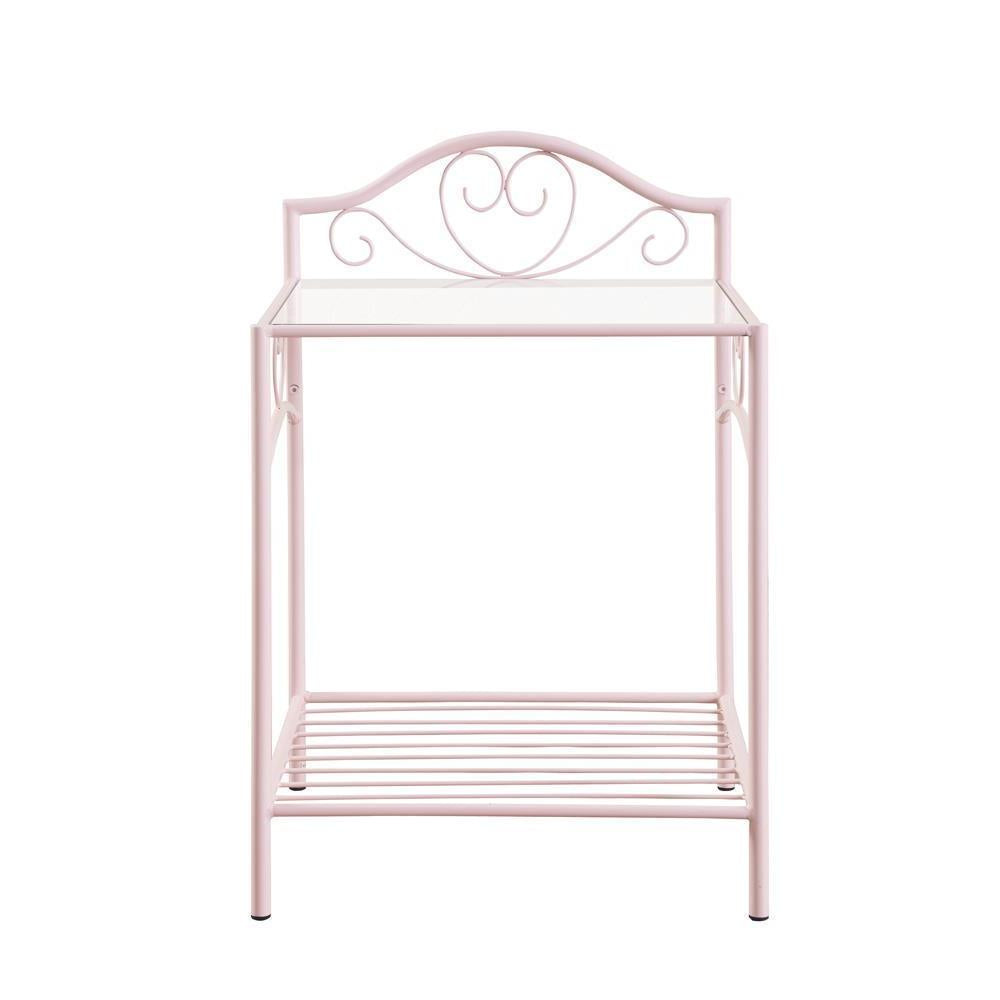 Pretty in pink, this gracefully designed nightstand adds an element of delicate class to a child's or teen's bedroom. enjoy a romantic silhouette combining linear and curved elements with tender, ornate accents. steel construction offers durability in a nightstand with a powder pink finish. a clear tempered glass top gleams to offer an elegant embellishment. a slower slatted shelf doubles storage options to make this nightstand a contender.