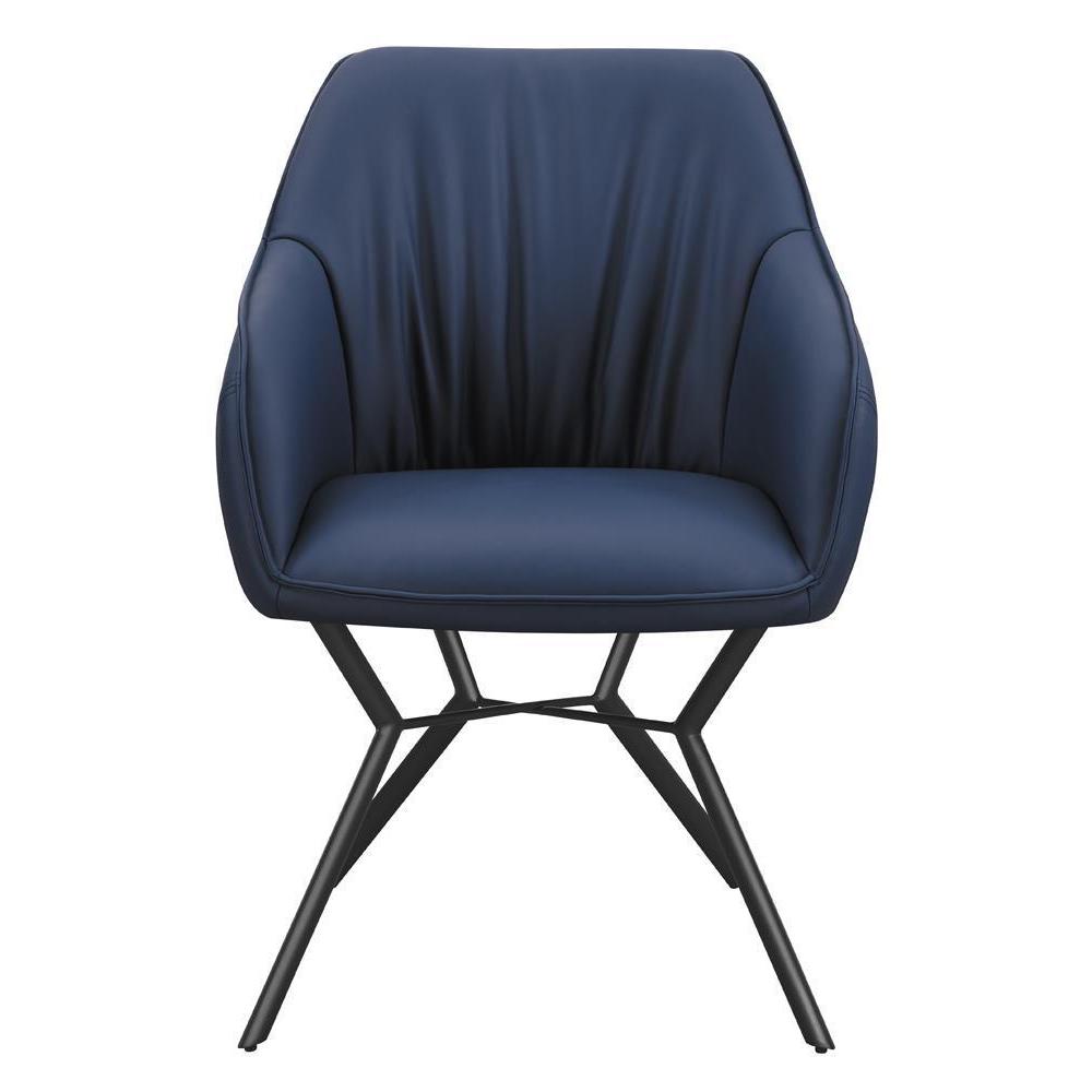 Retro vibes and mixed materials elevate the look of this contemporary dining chair. an upholstered seat features elegant, sloped armrests and a blue leatherette interior, wrapped with a diamond-quilted brown leatherette back fabric for a subtle contrast. welt trim details and a loosely gathered back create a timeless, yet comfortable and casual touches. this dining chair rests also on a metal base with a gunmetal finish that offers a sleek, stylish look. slim angled legs flare outward dramatically, offering up a vintage throwback.