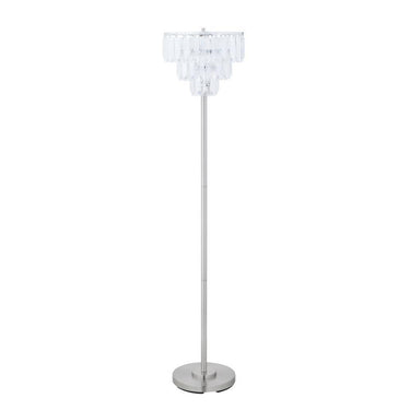 This silky smooth crystal floor lamp has a polished brilliance that you'll appreciate. it's versatile enough to add elegance and shine to a formal living room or spruce up a stuffy office. its sleek silhouette is anchored by a tiered round base crafted of smooth chrome. the slender profile continues with a chrome stand topped by magnificent crystal pieces that dispense dynamic colors and accents to any room. use it to light up a contemporary console table or place it between to accent side chairs and have engaging conversations while sipping on after-dinner brandies.