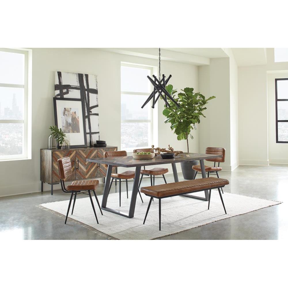 Pull up this long upholstered bench seating to a dining table or place at the foot of a bed. perfect for an industrial style loft apartment or modern farmhouse home, this bench offers padded cushion for complete comfort and support. the foam-filled bench cushion even lends a vintage, boho-chic charm with a hand dyed goat leather fabric in a warm camel of dark espresso hues and a channel tufted design. each end of the bench is supported by tapered and flared metal legs in a deep black finish. this bench is part of the misty collection, which also offers matching chairs, as well as a coordinating dining table and server.