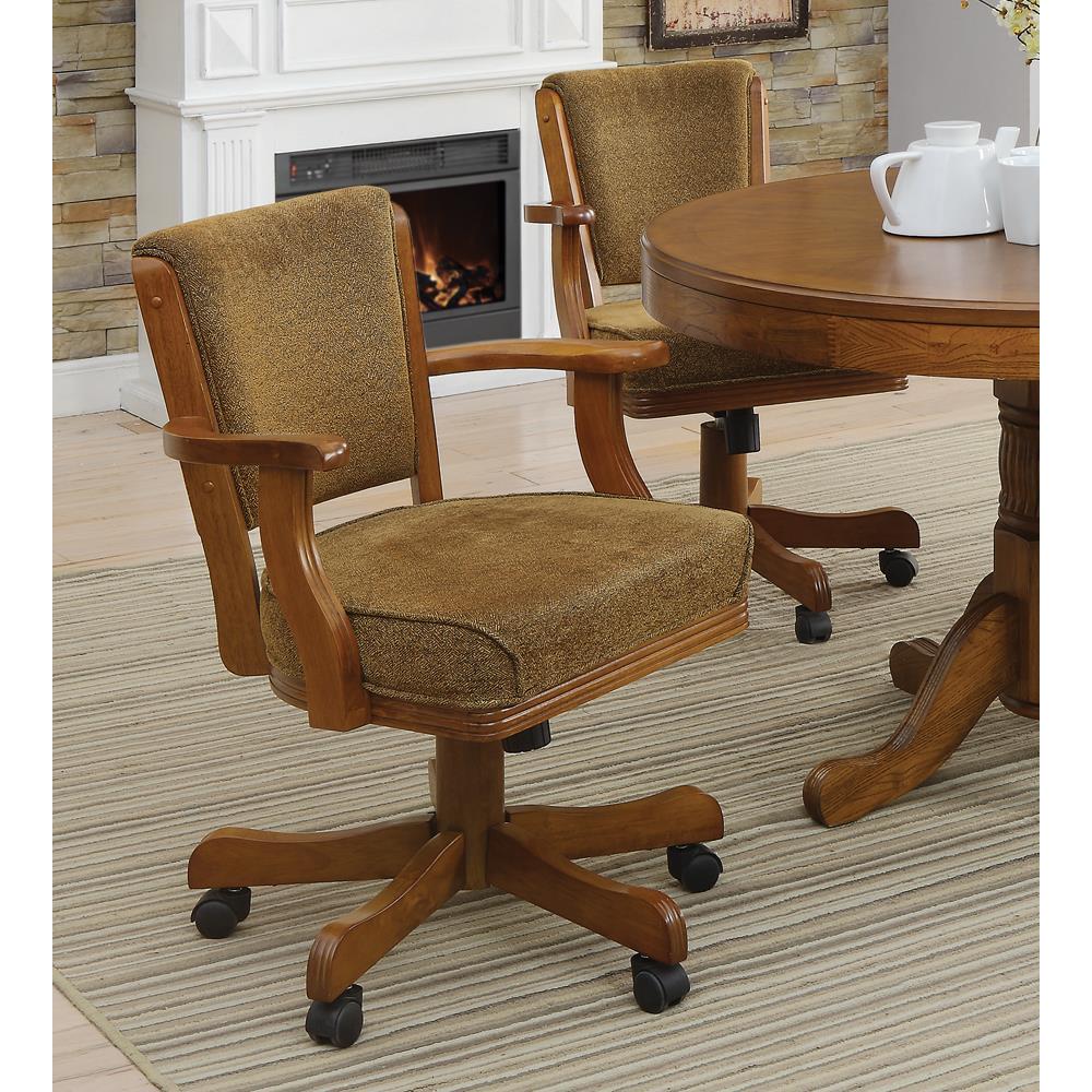 The exquisite comfort and pleasing design of this rolling chair is wonderfully appealing. with stylish sensibility, it's an ideal seating option for an office or recreation room. its thick, plush seat is upholstered in soft, olive-brown fabric. a beautiful chestnut finish is a pleasing complement to its stately silhouette. featuring sturdy arm and back supports, this chair is a stylish and practical choice for comfortable relaxation.