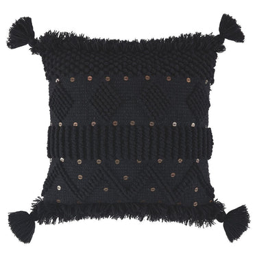 Tribal design gets a modern upgrade in this cool decorative pillow. A textured black ground is highlighted with goldtone accents making for a very chic way to add interest to your space.