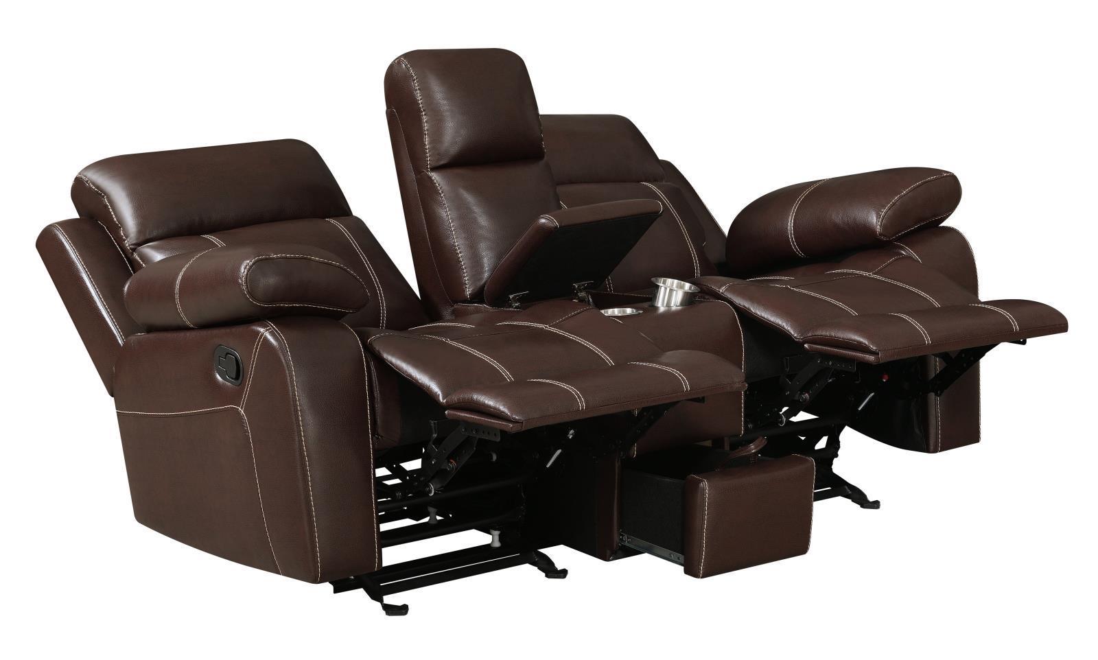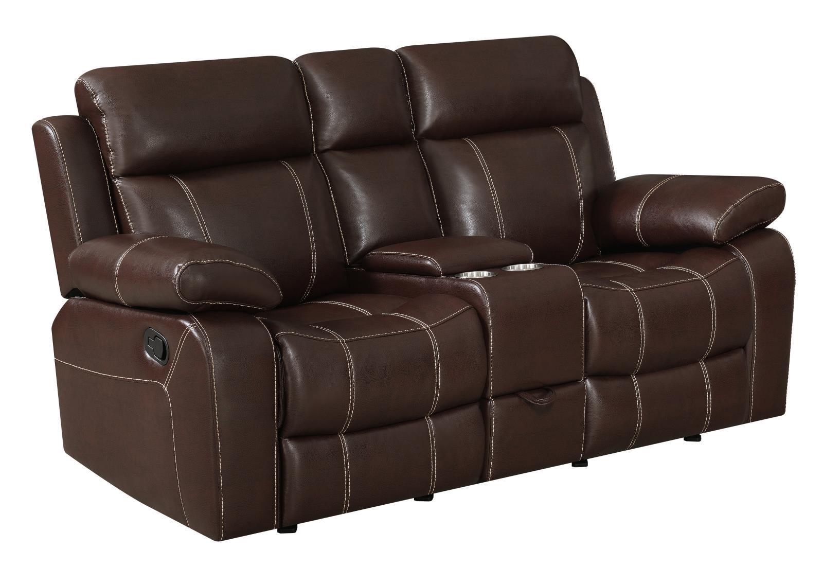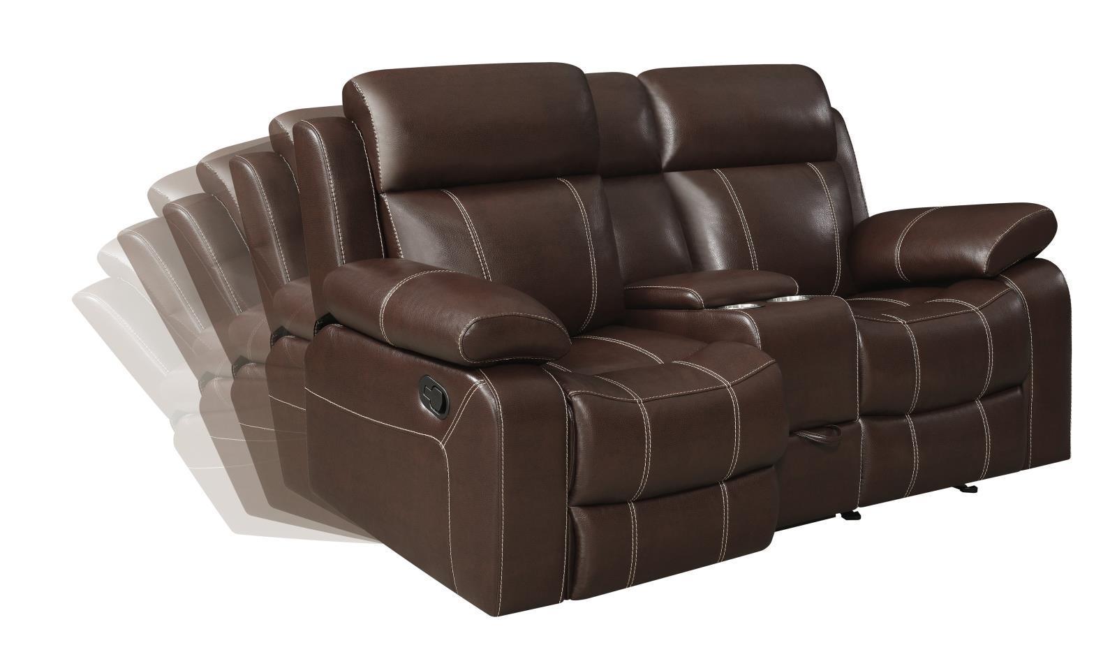 Elegant details from this classic glider loveseat transform a living room. great for game or movie nights, the plush and breathable chestnut upholstery creates a smooth and sleek look. contrasting baseball stitching adds visual intrigue and style along the back, seat, and sides. stuffed back cushions offer a head rest and lumbar support while scooped seating is great for sitting back. relax with the overstuffed arm rest cushions.
