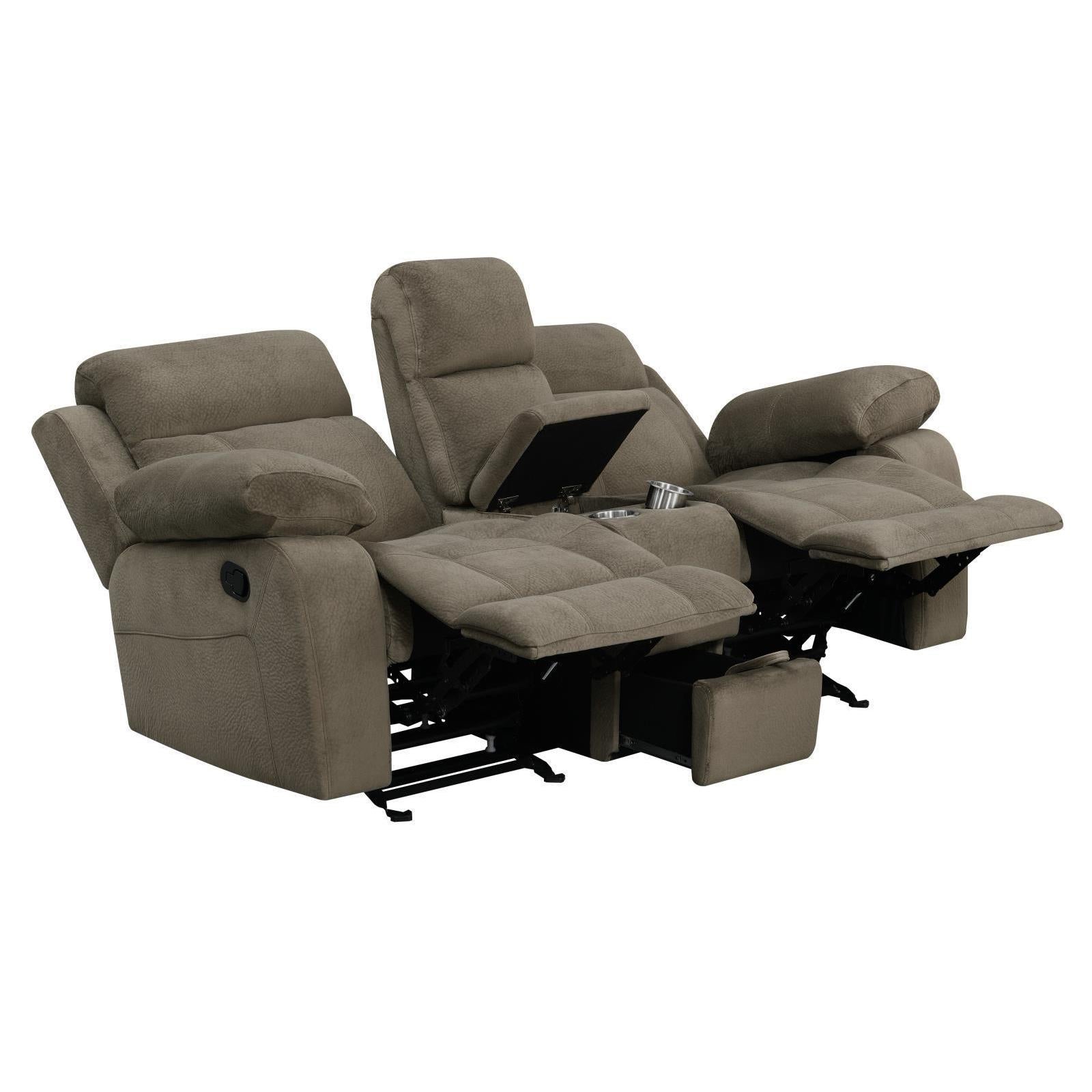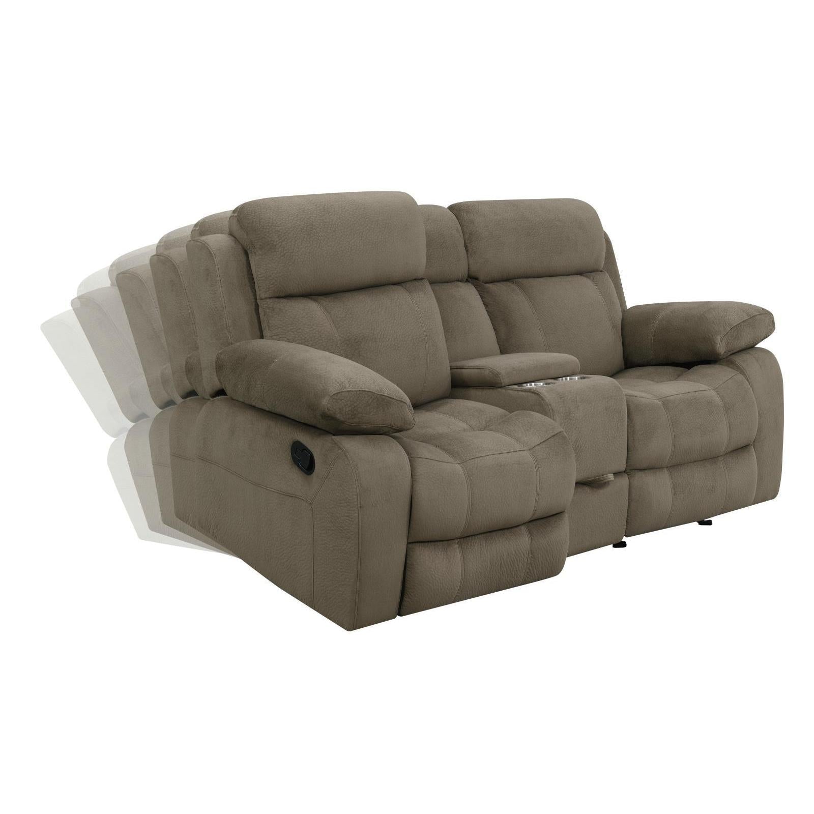 Elevate your den or living room with lush, luxurious comfort. this glider loveseat features thick, plush, pillow-top cushions on its armrests, as well as padded seat backs and headrests. upholstered in velvet, it's exquisitely soft to the touch. the fabric boasts a lovely, understated shade of mocha that looks especially lovely with an earth toned color palette. with a built-in cup holder and storage drawer, this sofa offers a high level of comfortable convenience that enhances any home.