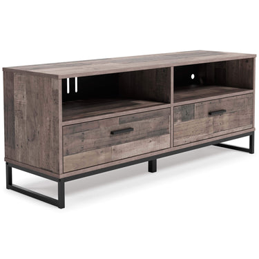 Streamlined design and a butcher block finish come together in this TV stand. It's sure to impress with two smooth-gliding drawers, metal legs and a rich brown finish over replicated pine grain texture. Entertain and store electronics with this perfect marriage of mid-century and current styles.