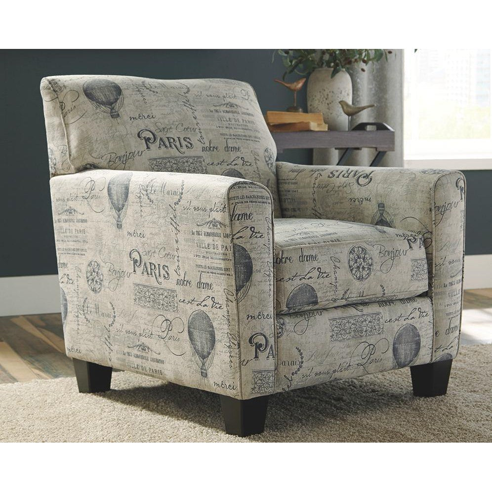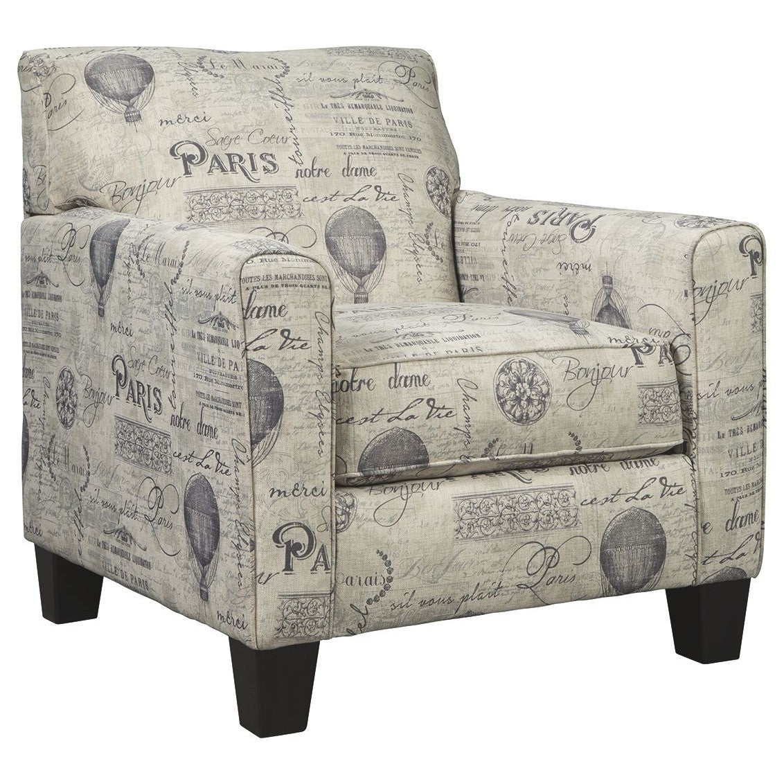 The feeling of love in Paris is reflected in this accent chair. Club silhouette charms you with French script in gray. Linen-like softness seals the deal, appealing to your flair for relaxation. Set it up in a cozy reading nook or with a gray sofa for casually cool vibes.