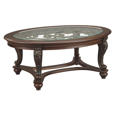 This oval coffee table deserves a toast for incorporating so many elements so seamlessly. Swirls of metal accents add a lovely dimension under a beveled glass inset tabletop. Their fanciful pattern is echoed in the carvings and curves of the richly stained legs and stretchers.