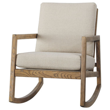This accent chair is a natural beauty. Neutral fabric on light wood tone frame expresses a humble and inviting quality. Sleek rocking chair profile is a worthy addition to a reading nook or sitting area. And with cushions so plush, you're in for a relaxing time.