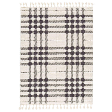 Fresh and of the moment, this area rug adds the right amount of chic to your space. A timeless plaid pattern of white, black and shades of gray will stand out with its contrasting details. The rug's high-low design with braided tassel edging seamlessly integrates into any existing decor. Let this piece be the star of your home.
