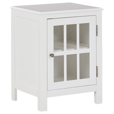 Casual style and function are made easy with this accent cabinet. This versatile storage solution in a white finish is a perfect place to stack bowls, plates and linens. The lattice door front with clear inset glass allows you to show off its contents, allowing for endless decorative possibilities.