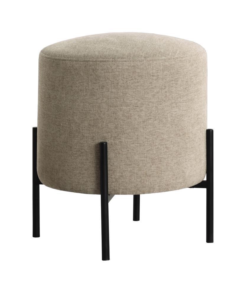 Round in shape with sleek, thin rod-like metal legs, this modern ottoman offers a minimal flair and extra seating. wrapped in a soft-to-the touch chenille upholstery, this ottoman invites you to kick up your bare feet. supported by a cross-brace design, the legs give a floating appearance and striking contrast with their matte black finish. perfect for adding a retro touch or boho vibe to a space, this round ottoman works in contemporary living rooms and mid century modern homes. the chenille fabric comes available in three different shades, allowing you to match as you wish.