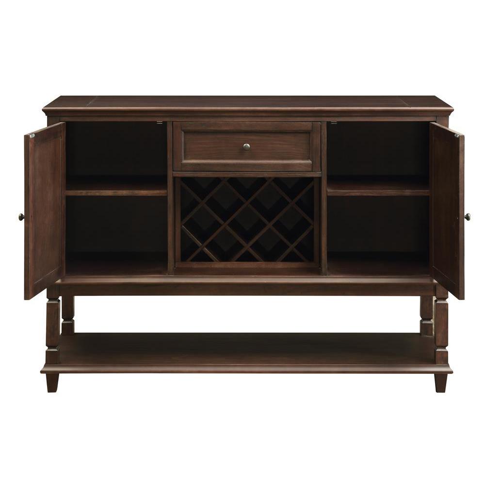 Deep and rich, this transitional classic server is great for a dining room. in a rustic espresso finish, the one-drawer and two door base are raised by tapered legs. the lower storage shelf and built-in wine bottle rack help to keep dinner essentials at hand. dress up a neutral space with this dark server that is versatile and stylish. the smooth silhouette is given dimension with elevated edges.