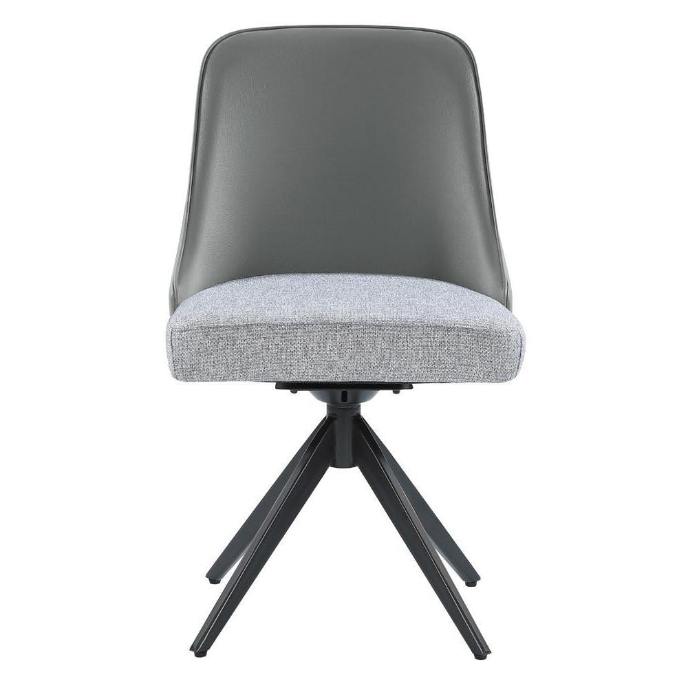 Retro-inspired influences elevate this modern dining chair into a playful seat at the table. designed as a swivel chair, adults and kids alike will appreciate this conversational furniture piece, rotating to refill beverages and chat with guests. with a bucket-like seat, this upholstered chair is upholstered in a smooth gray leatherette across the backrest and a light gray textured fabric on the seat for a two-tone effect. the swivel base extends and flares outward dramatically with black gunmetal finish legs. slide this chair up to a dining table or even an office desk for a chic, almost vintage vibe.