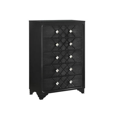 Elegant with undeniable glitz and glam, chose this five-drawer chest for its exceptional design and storage options. its five drawers are favored for storing your favorite garments. the felt-lined top drawer easily holds your delicate items in safekeeping. the allure of its black finish is sure to be recognized with embossed panels on the drawers. enjoy the stylish diamond-shaped hardware for an extra touch of sparkle.