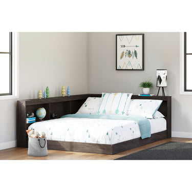Two-toned with dark charcoal finish over replicated oak grain and a replicated sugarberry wood grain. Inset drawers with matte black colored knobs. Ball bearing glides offer a smooth opening and closing of the drawer. Nightstands feature open shelving. Vinyl wrapped drawer sides and back for extra durability. Safety is a top priority, clothing storage units are designed to meet the most current standard for stability, ASTM F 2057 (ASTM International). Drawers extend out to accommodate maximum access to drawer interior while maintaining safety. All cases feature splay legs. Headboard legs have adjustable height options for optimal relationship to bedding height. Platform beds (EB5514-111,112,113) include footboard, rails and platform (no additional foundation/box spring needed). Twin (163,182) and full (165,182) bookcase beds do not require an additional foundation purchase. Slim profile dual USB chargers included with the T/F bookcase storage headboard (163/165). Twin (121) and full (122) tent complete bed in box do not require an additional foundation purchase. Assembly required. These pair well with EA5514 and EW5514.