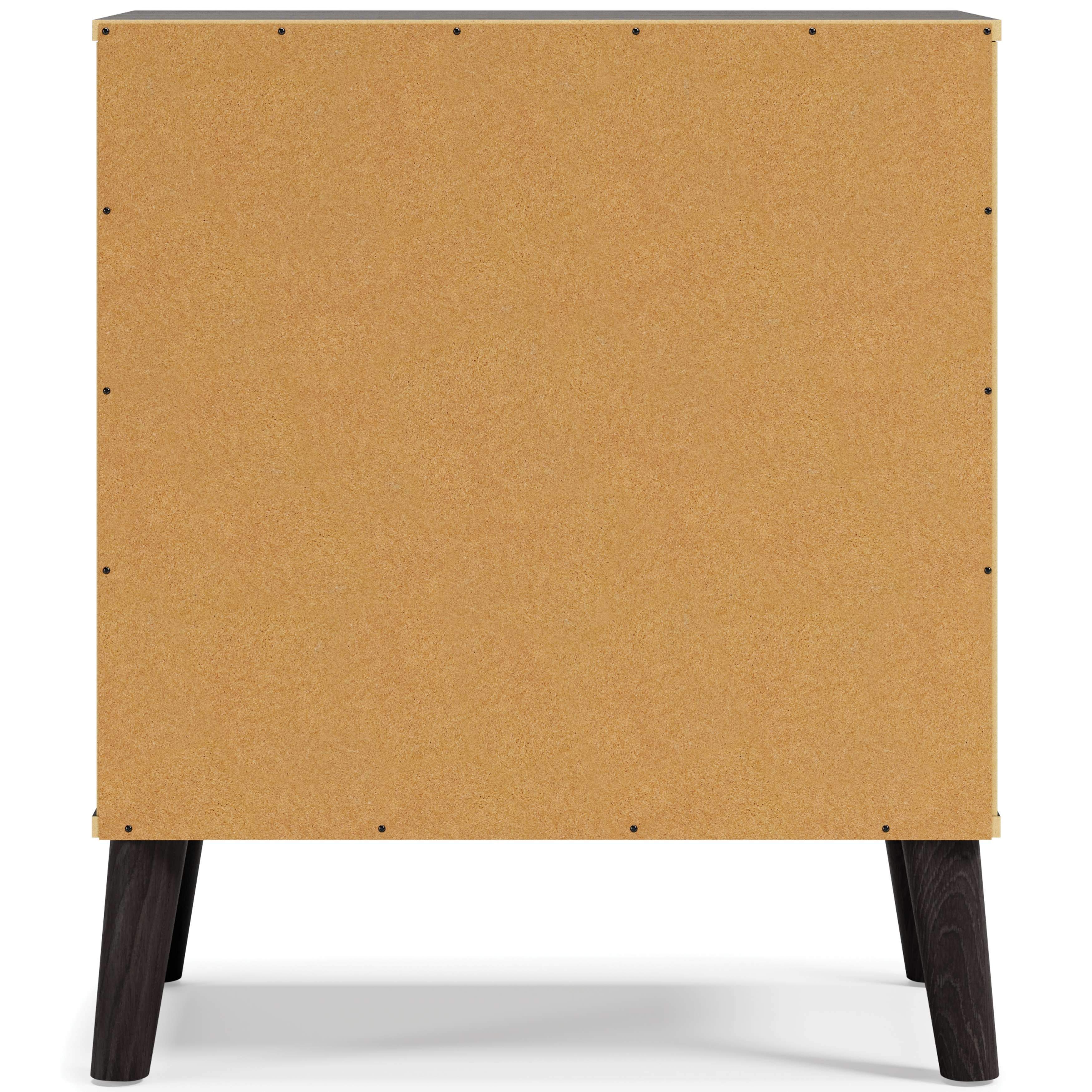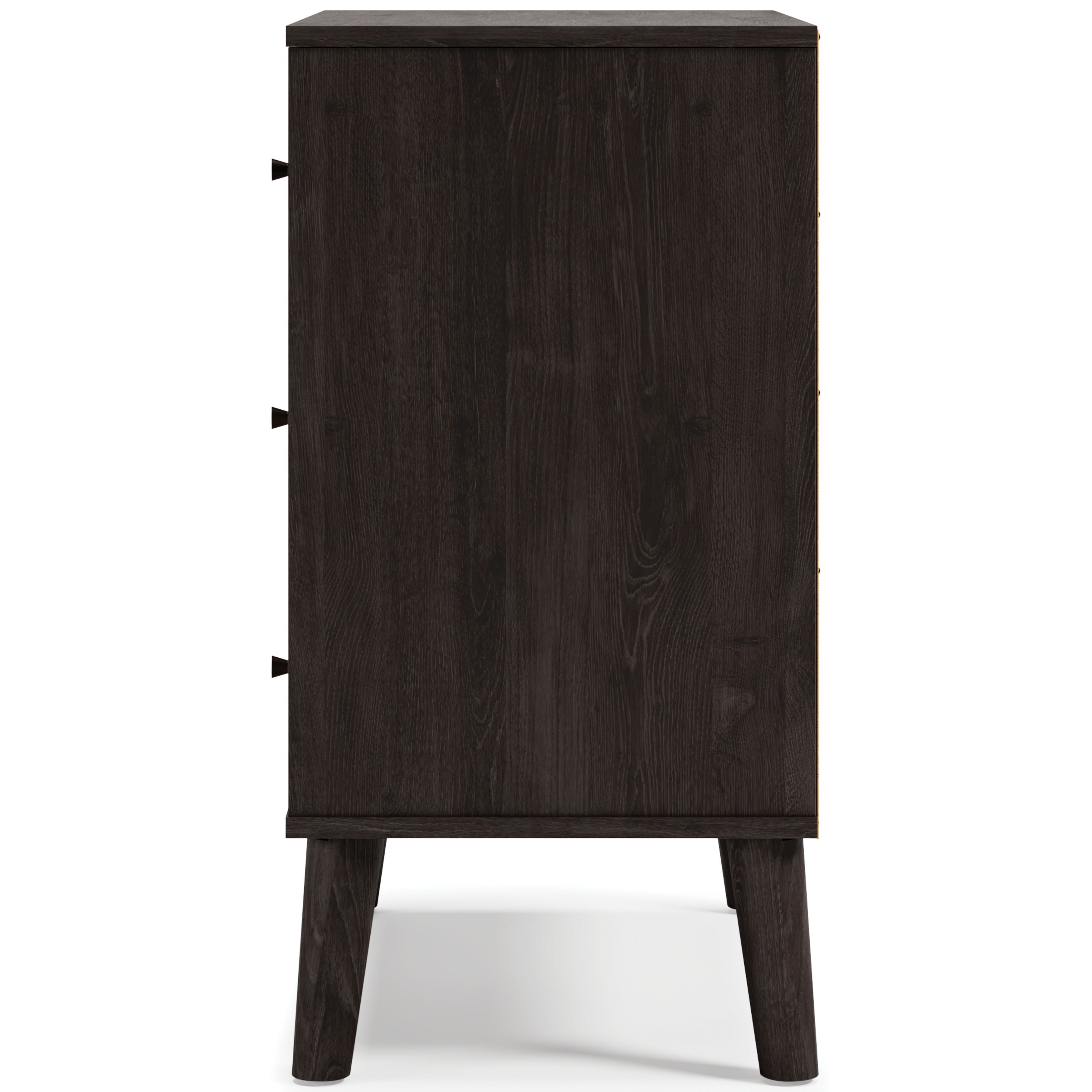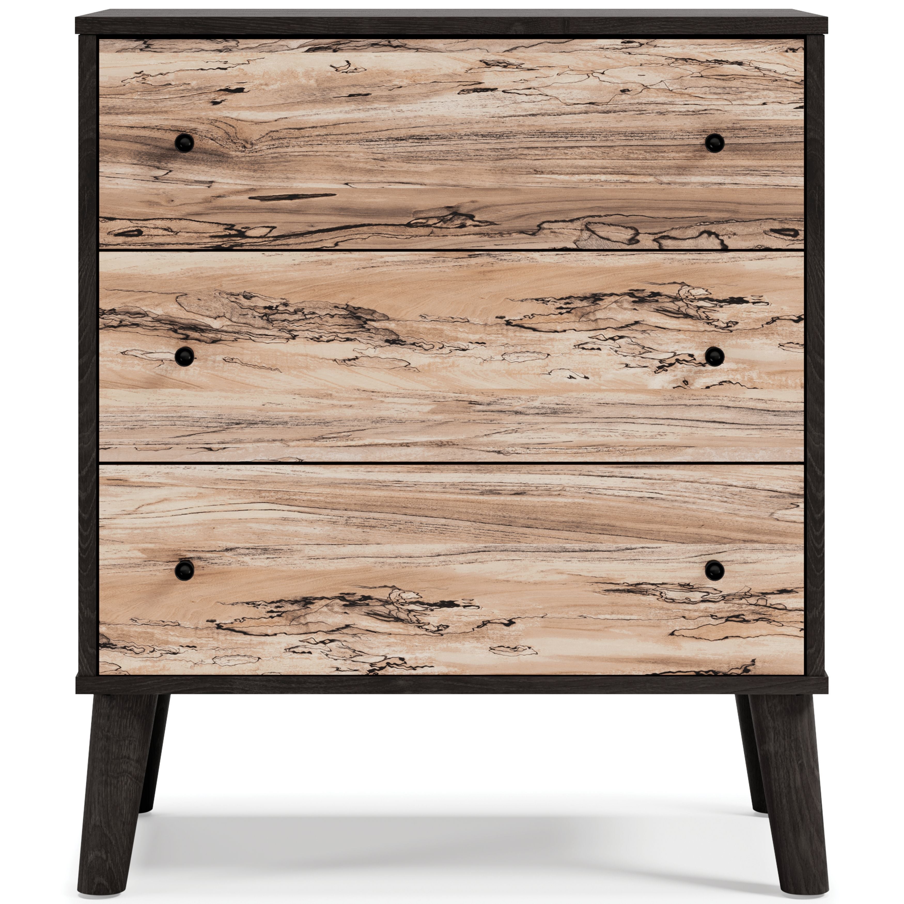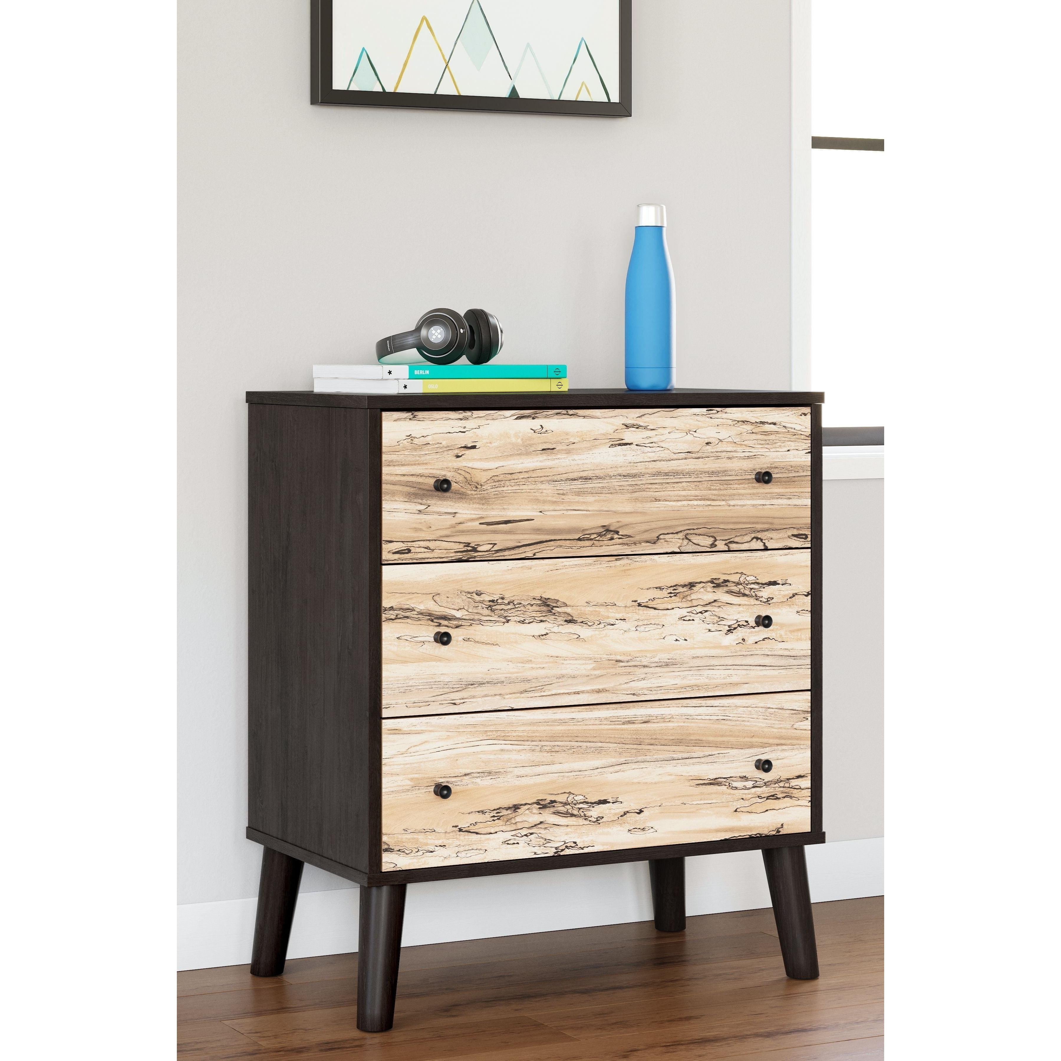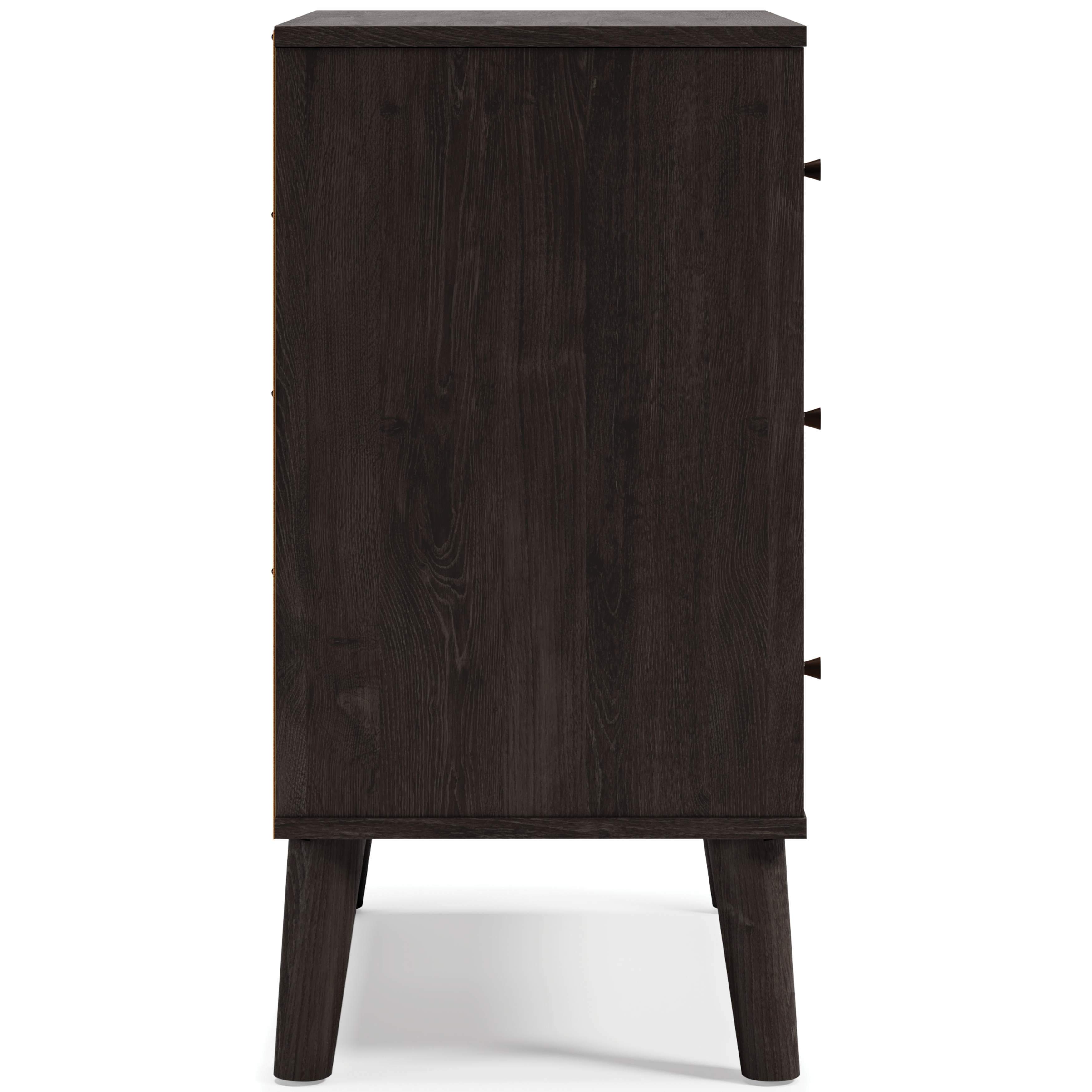 The perfect marriage of simple and contemporary style, this chest of drawers is a charming addition to your home. It sports an expressive two-tone look, with a dark charcoal finish over replicated oak grain with an authentic touch and a replicated sugarberry wood grain. Ball bearing glides offer smooth opening and closing of the drawers, while matte black knobs and splay legs add a finishing touch.