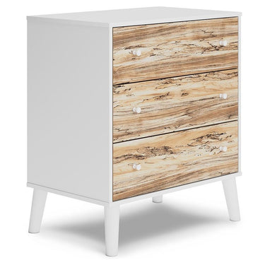 The perfect marriage of contemporary and casual style, this chest of drawers is a charming addition to your home. Its two-tone color scheme, with a solid white matte finish and a replicated sugarberry wood grain pattern, is warm and inviting. Ball-bearing glides offer smooth opening and closing of three inset drawers, while white knobs and splay legs add a finishing touch.