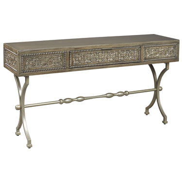 This console sofa table is style with a purpose. This casual look flaunts a medallion pattern along the front. Champagne color finished metal complements the antiqued gray finished wood. Show off decor on top. Rest assured X-base is as strong as it looks. Functional drawer allows you to keep knickknacks out of sight.
