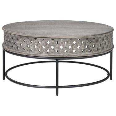 This round coffee table is reserved for those carving out a cool, eclectic aesthetic. Elements of this distinctive table crafted with India mango wood include hand-carved aprons forming an open lattice weave. Metal frame in matte black is a striking complement to the tabletop's burnished gray finish.