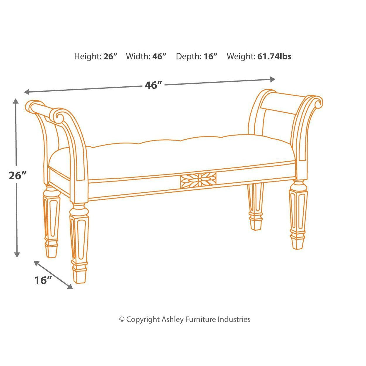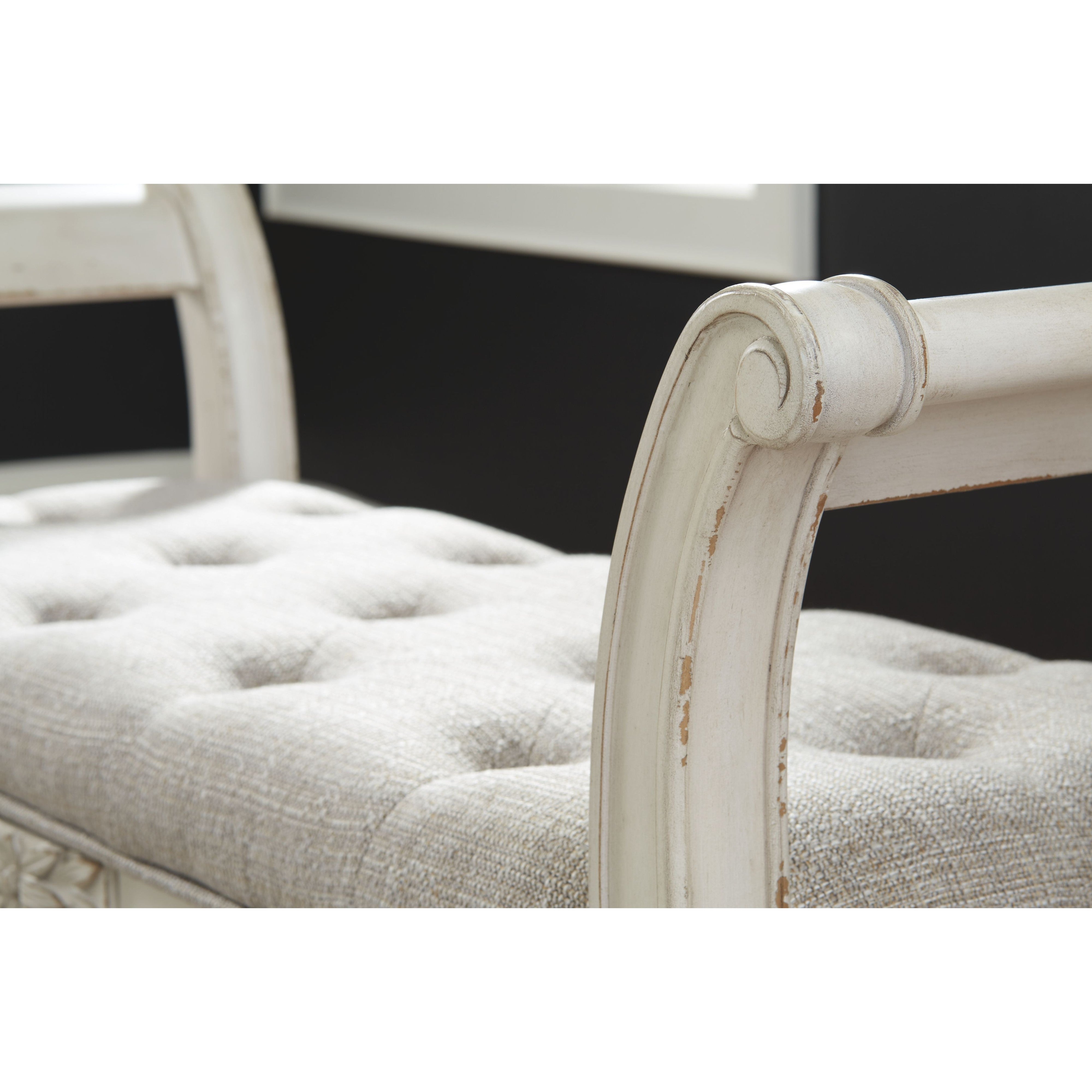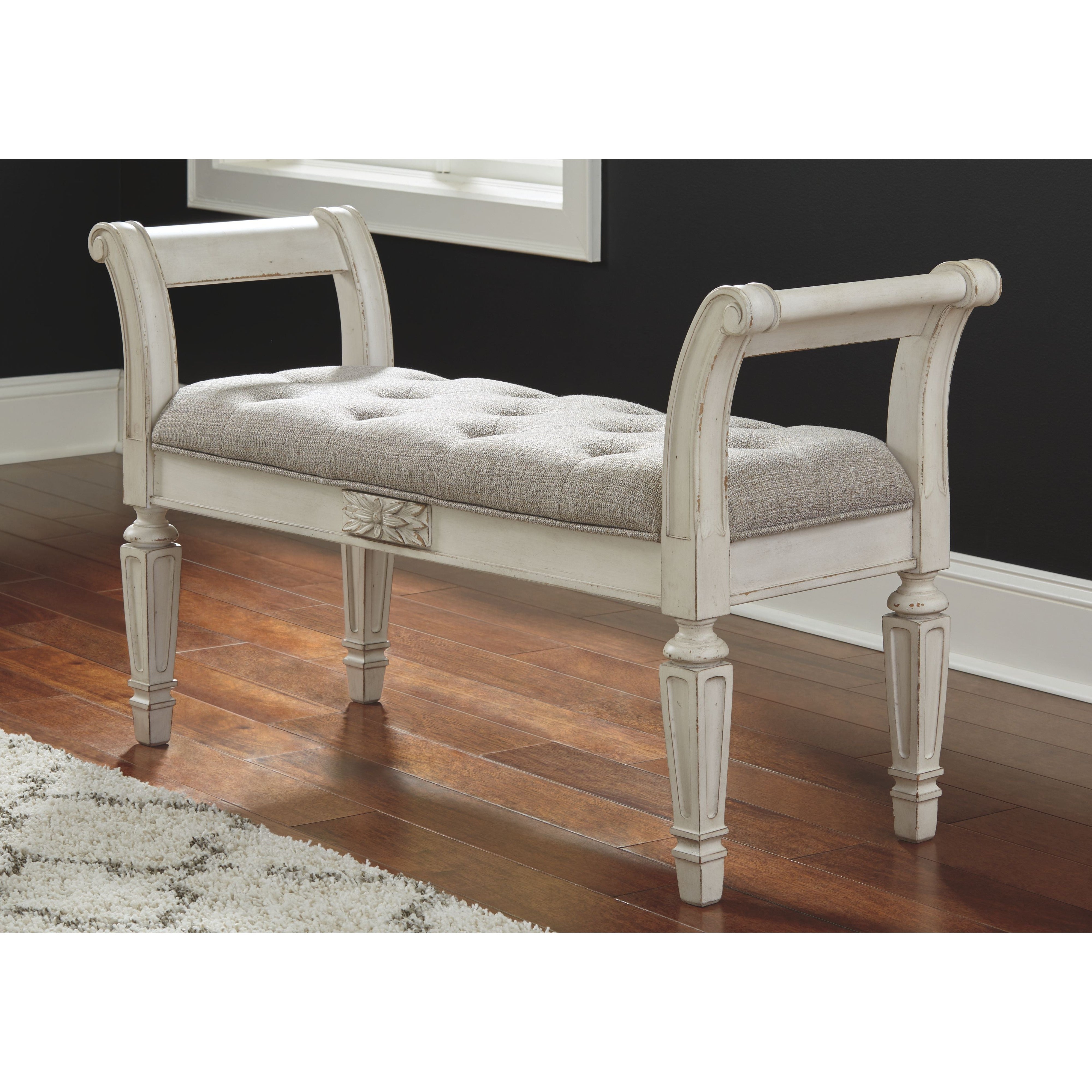 A classic to be cherished for years. This accent bench is a timeless treasure. Quality wood frame flaunts an antiqued white finish. Touches like the scrolled arms and floral applique give this piece so much character. You'll love sitting on the cushiony, tufted seat in all of its sophistication.