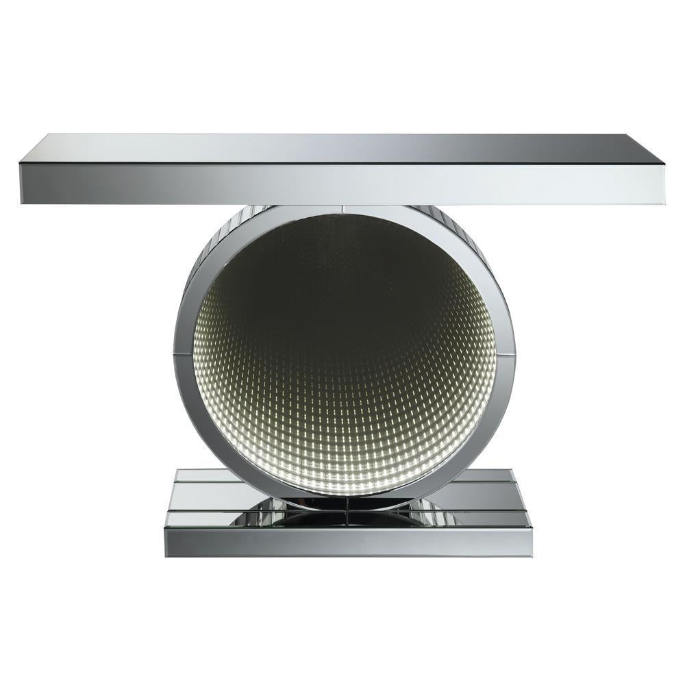 Take breaths away with the striking design of this modern console table. perfect for the stylish host, a dazzling silver finish covers a geometric silhouette. the base features reflective mirror details and is topped by a circle adorned with rectangular mirrors. open up a space with the airy silhouette and glass details. the perfect combination of playful elegance, this table is perfect for pictures or as a stylish home bar.