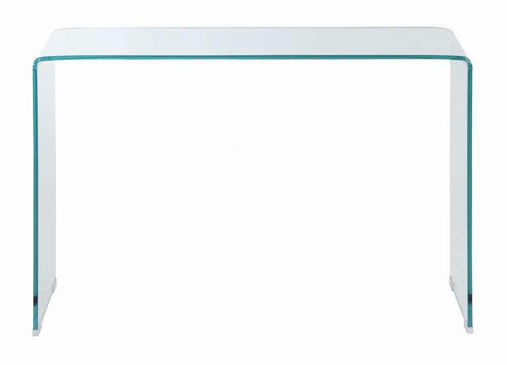 This impressive sofa table comes in a contemporary, understated style that's perfect for the home. the table features a clear, single-piece design with a rectangular table top. customize the look with a decorative vase or a photo and a small collection of books. instead of a base, there's an open space design made for a large potted plant or small lamp directly on the floor for a touch of intimacy. with this table, a living room or den are transformed with a modern appeal that's sure to please.
