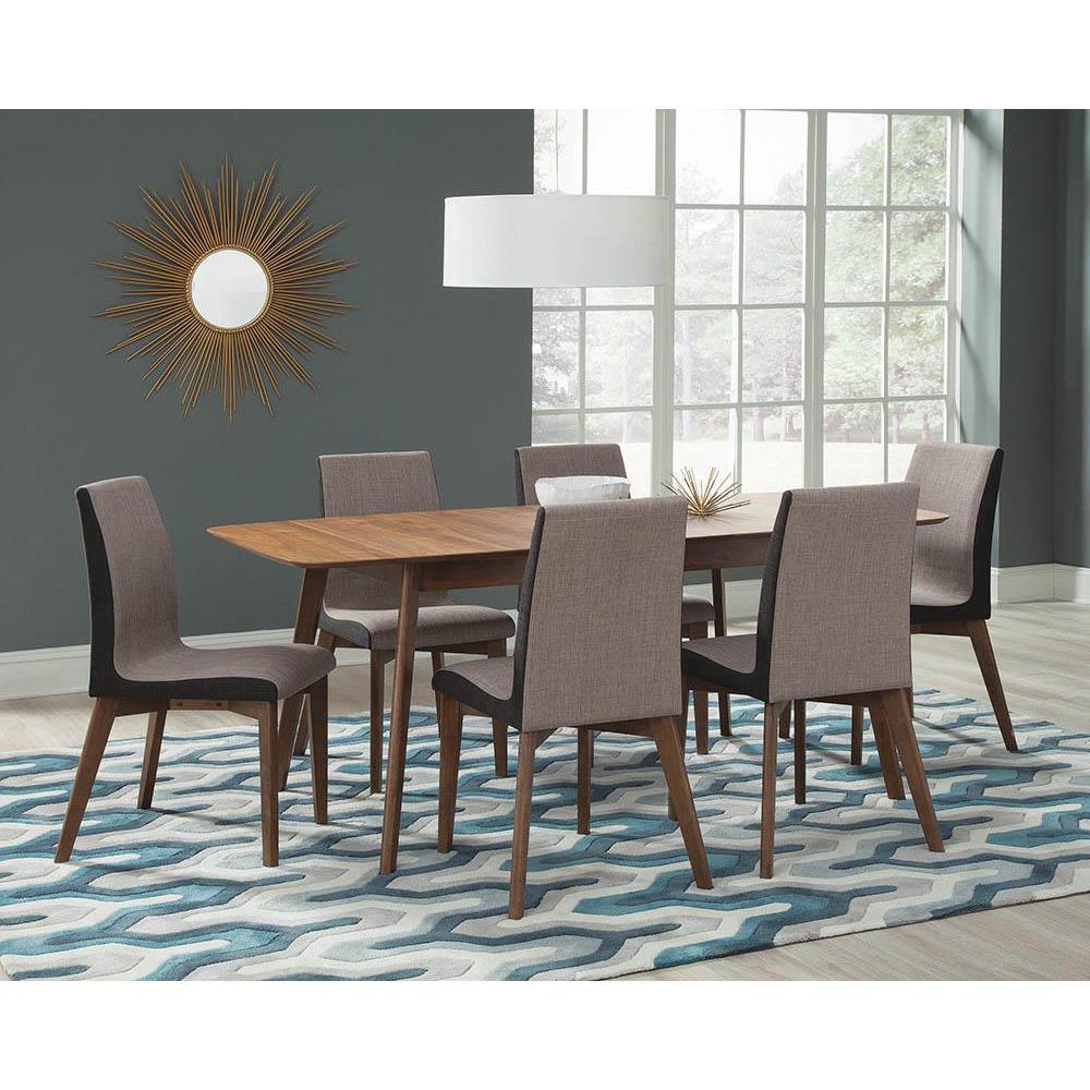 Captivating style lends an intriguing flavor. this dining chair offers sleek curves that increase its comfort level and aesthetic appeal. grey fabric upholstery offers a cool, versatile look. with natural walnut finish legs and frame, its dual-tone palette is a perfect blend. this chair reflects a transitional motif with a hint of mid-century styling.
