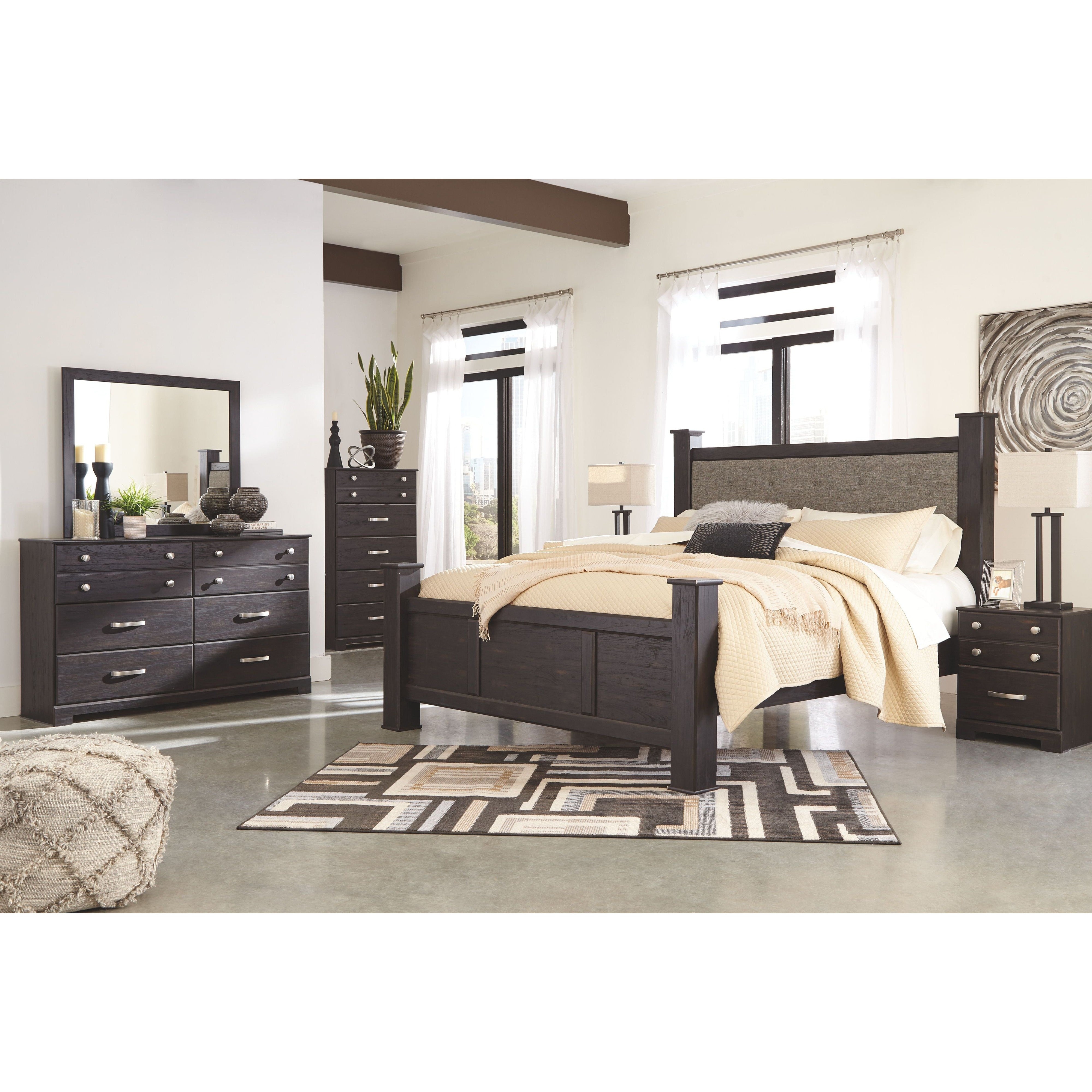 Dark brown replicated worn through paint finish. Large scaled satin nickel colored handles and knobs. Side roller glides for smooth operating drawers. Slim profile USB charger located on the back of the night stand tops. Large drawers provide ample storage space. Queen (67) and king (68) headboards feature a gray upholstered panel with button tufting details. Queen (65) and king (69) headboards can attach to a bolt-on metal bed B100-31 or B100-66 respectively. Queen (65) bookcase headboard is capable of attaching a full sized metal bolt on bed frame. King and queen storage footboards (54S, 56S) require the use of the B100-13 or B100-14 roll slats respectively. King poster bed requires the use of the king poster headboard posts (62). Safety is a top priority, clothing storage units are designed to meet the most current standard for stability, ASTM F 2057 (ASTM International). Drawers extend out to accommodate maximum access to drawer interior while maintaining safety.