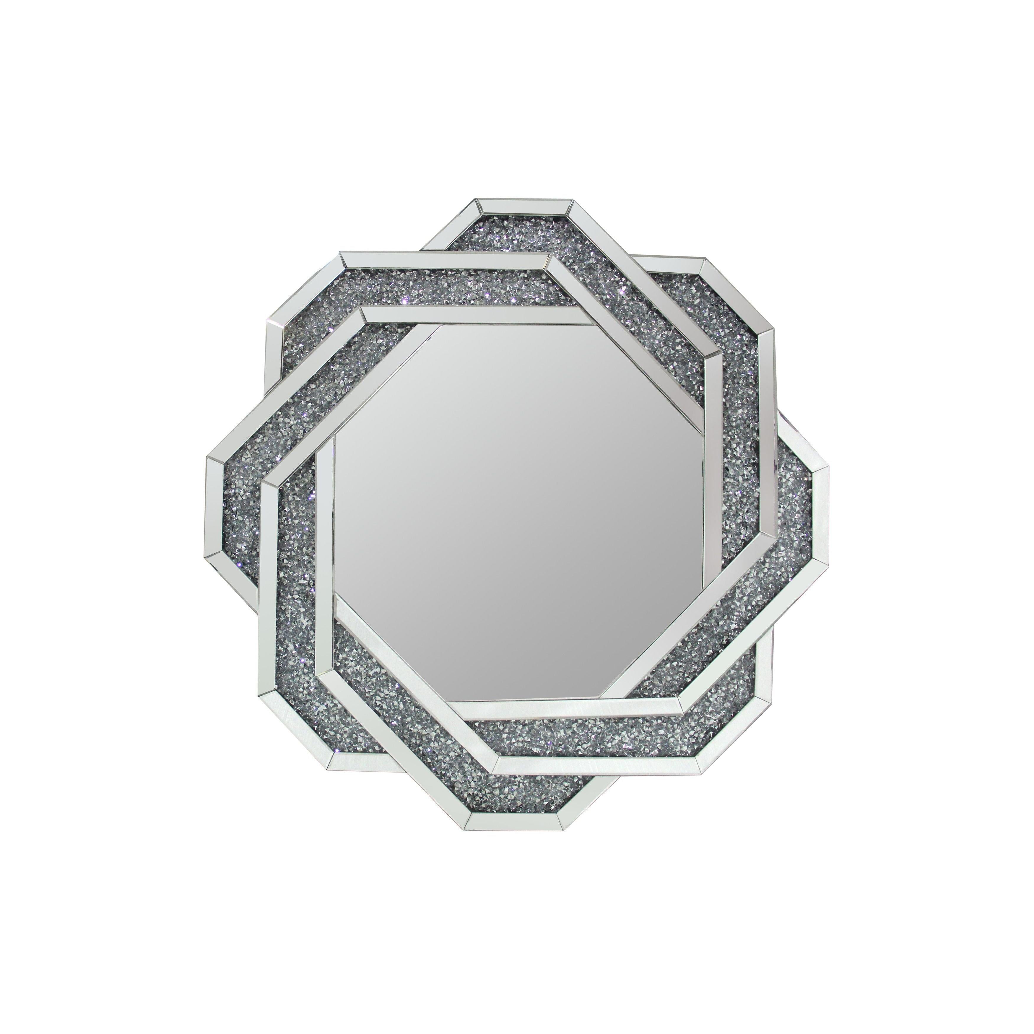A woven, braided frame design wraps around this contemporary round mirror. outlining each woven elements are mirror trim details, lending a polished look to this glam framed mirror. faux dark crystals inlaid between the mirror tile glimmer from beneath, catching the eye of anyone who passes. shimmering with silver elements and a light hue throughout, this reflective surface lends itself to any color palette, elevating the decor. place it in a foyer or mount it above a dresser or fireplace for a dramatic effect.