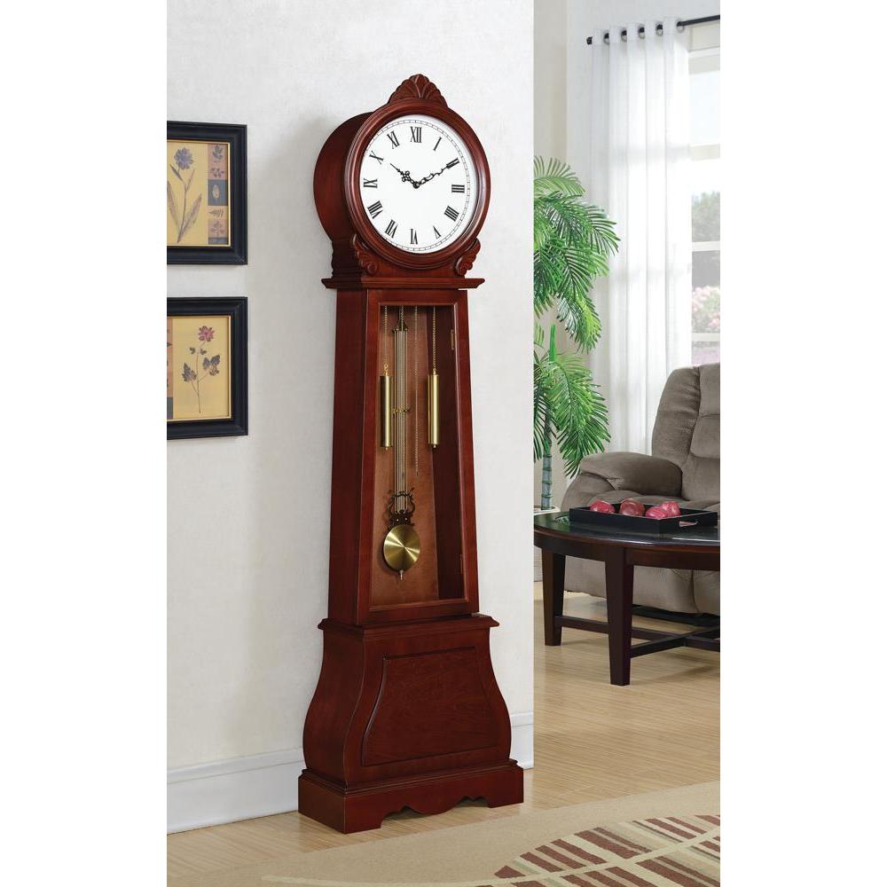 With an aesthetic that reflects a charming village theme, this grandfather clock adds a whimsical, historical flavor to a traditional space. a stylish round face offers balance to an ornate shaped base, delivering an artistic appeal. a warm brown finish radiates a tasteful glow and offers versatility for blending with a variety of palettes. enjoy storied westminster clock chimes at regular intervals. features a battery-powered movement.