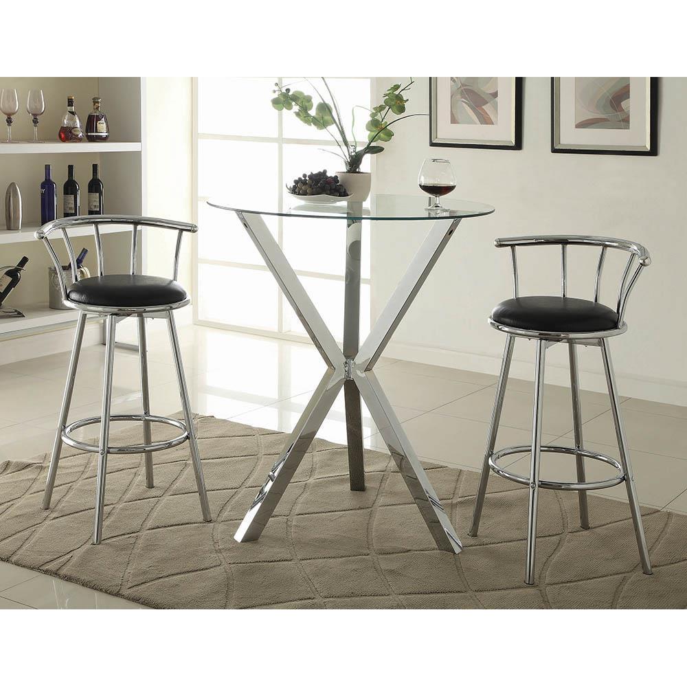 This contemporary bar table adds a touch of simple sophistication to a kitchen or breakfast nook. it features a bold x-shaped base in a shining chrome finish, giving it a sleek, striking appearance. a round glass top completes its elegant look. modern and stylish, this table is perfect for relaxing with a glass of wine after work or enjoying an intimate meal with someone special. pair it with matching swivel bar stools for extra comfort and style.