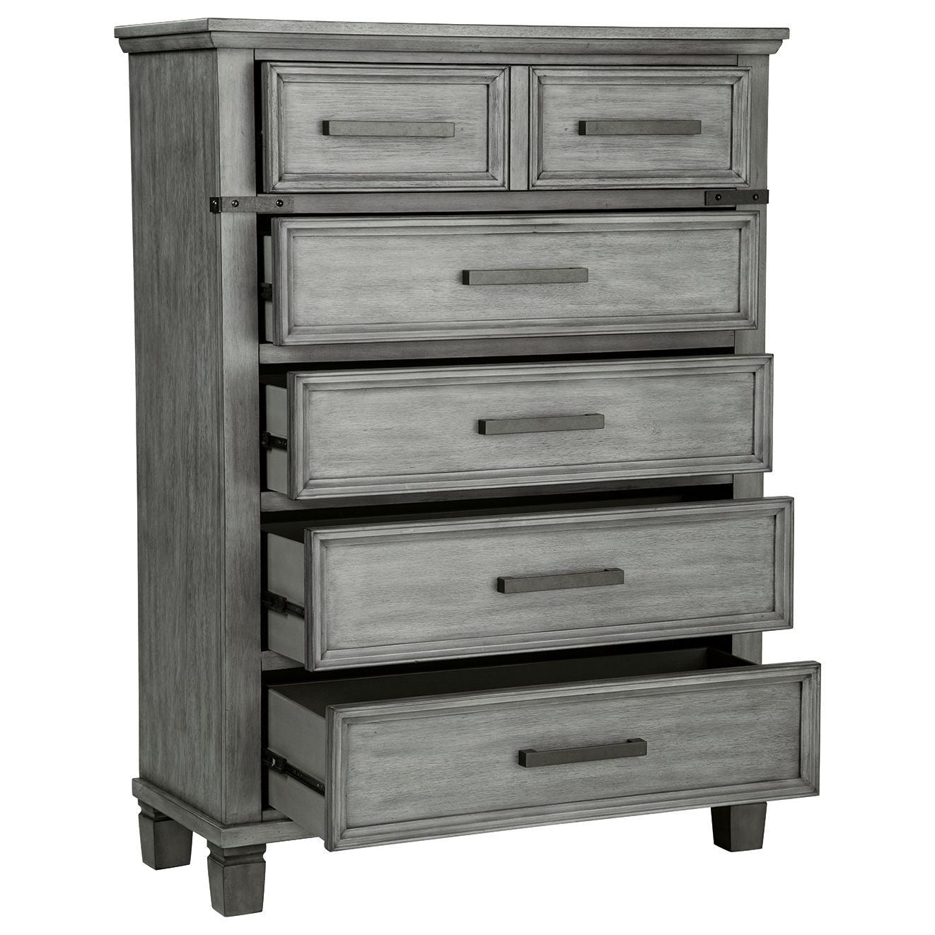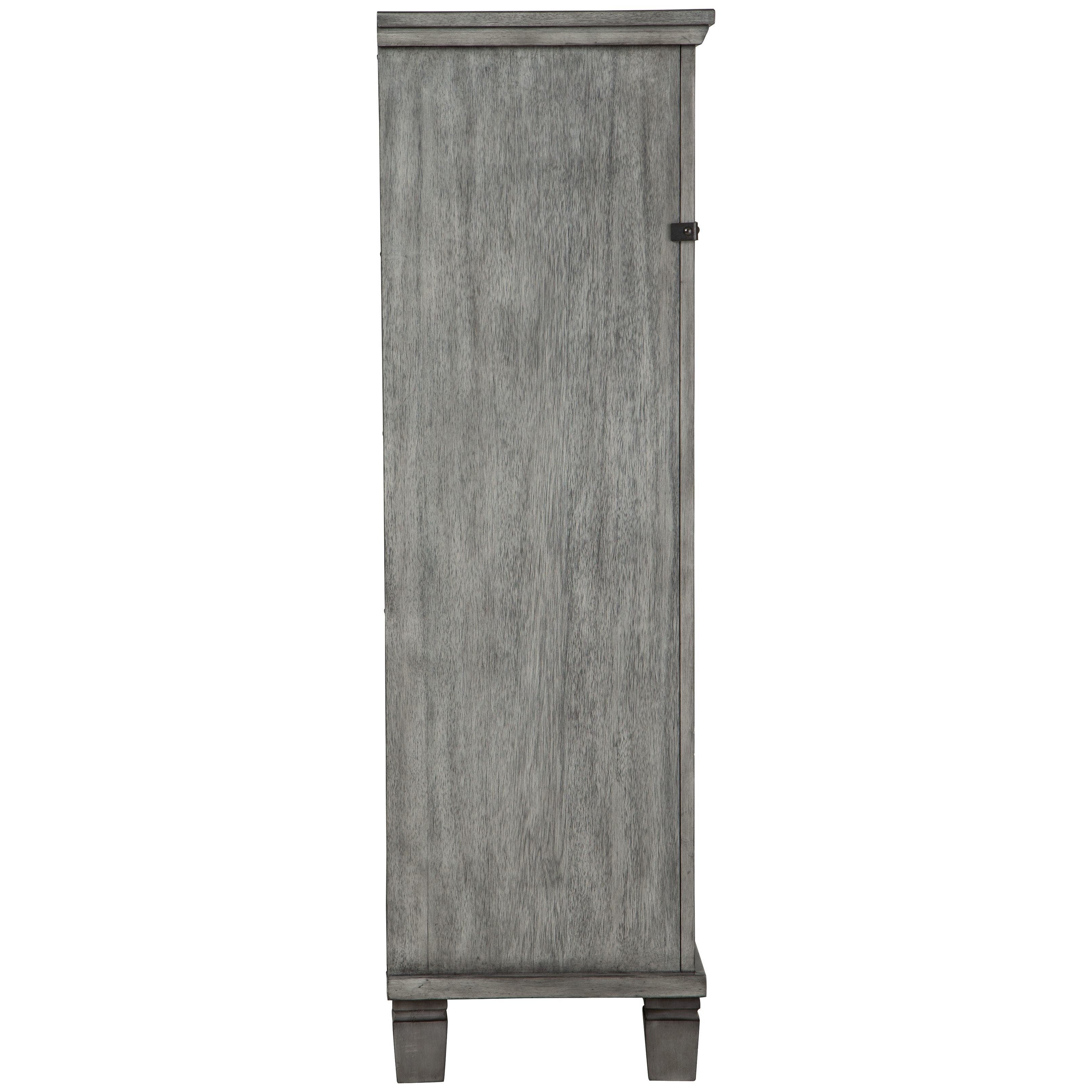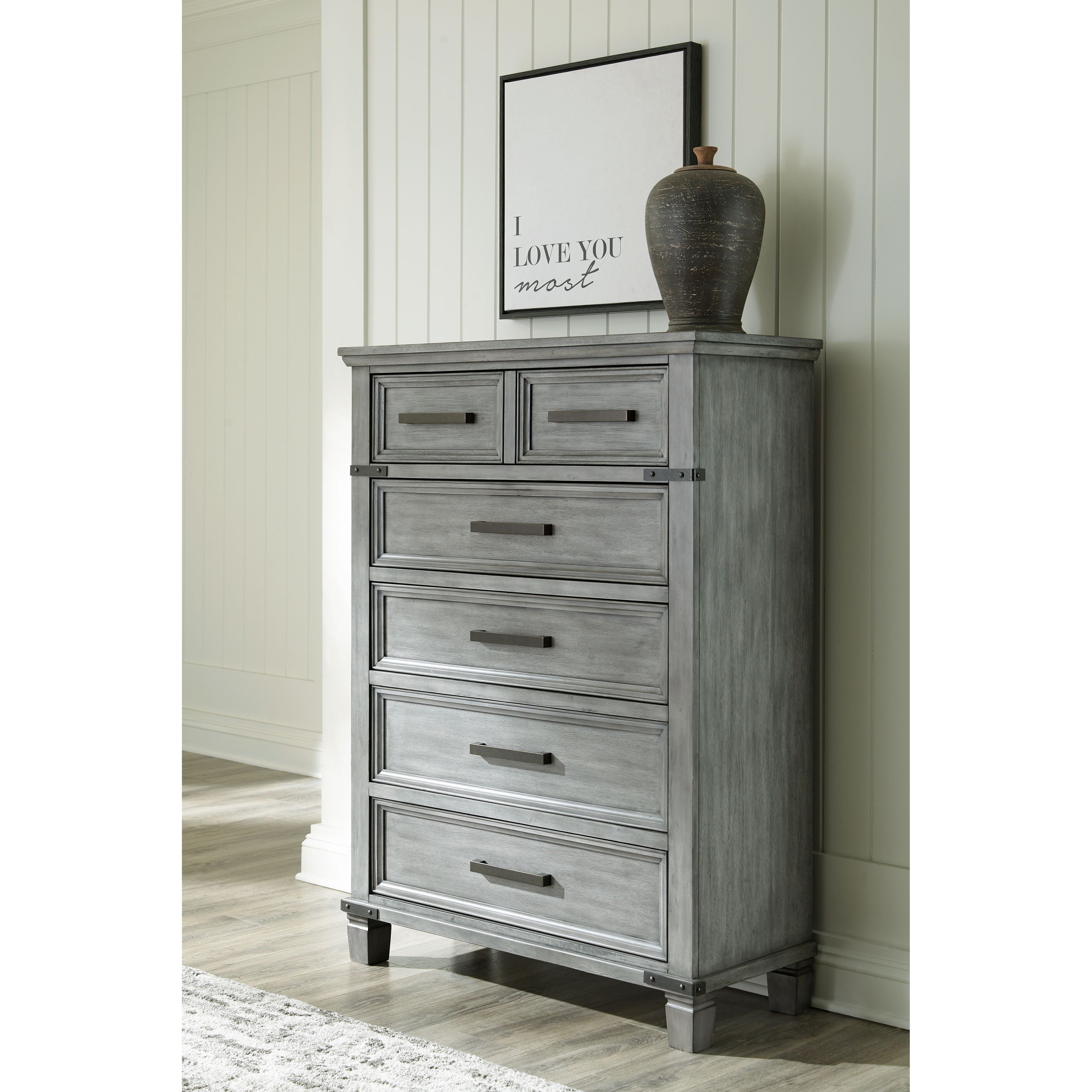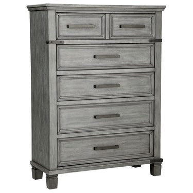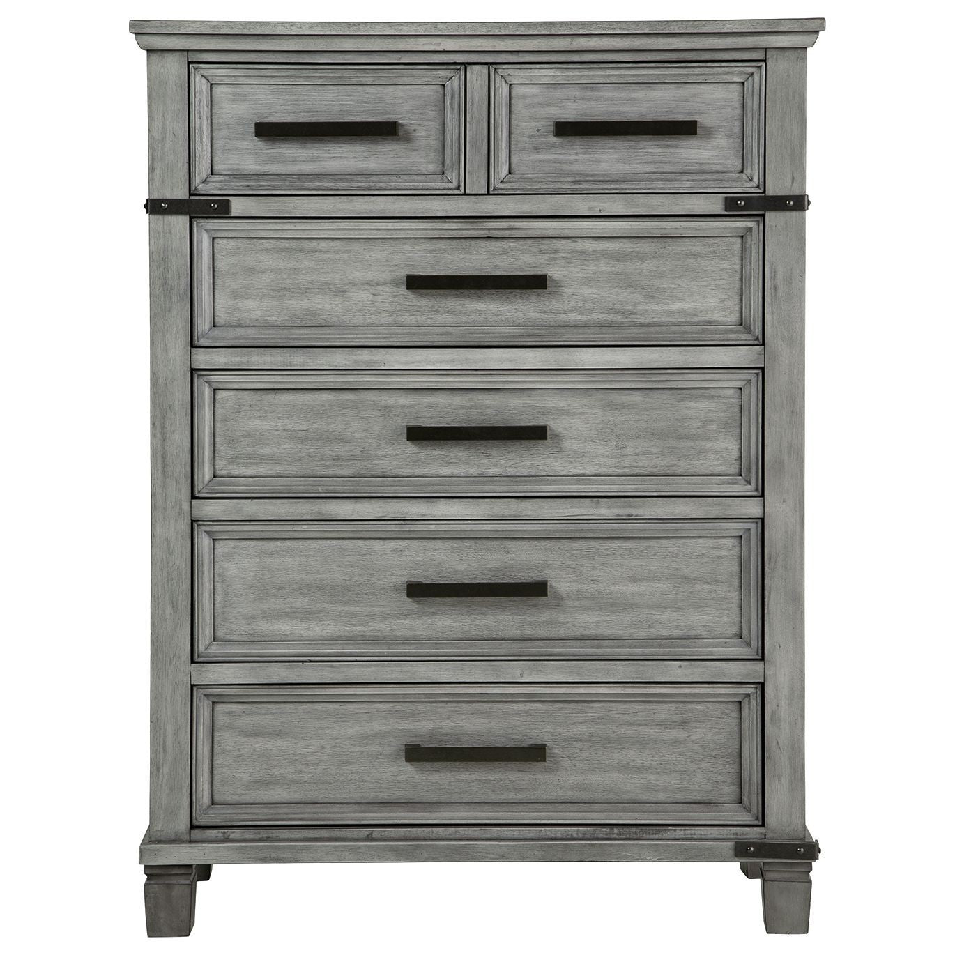 What's old is what's new with this chest. Serving up a fresh look in urban farmhouse style, the eclectic piece features a light weathered gray finish with dark aged bronze-tone bar pulls and metal straps for a casually cool sensibility. Profiled drawer frames, thick-profiled top moulding and tapered legs are the earmarks of timeless design.